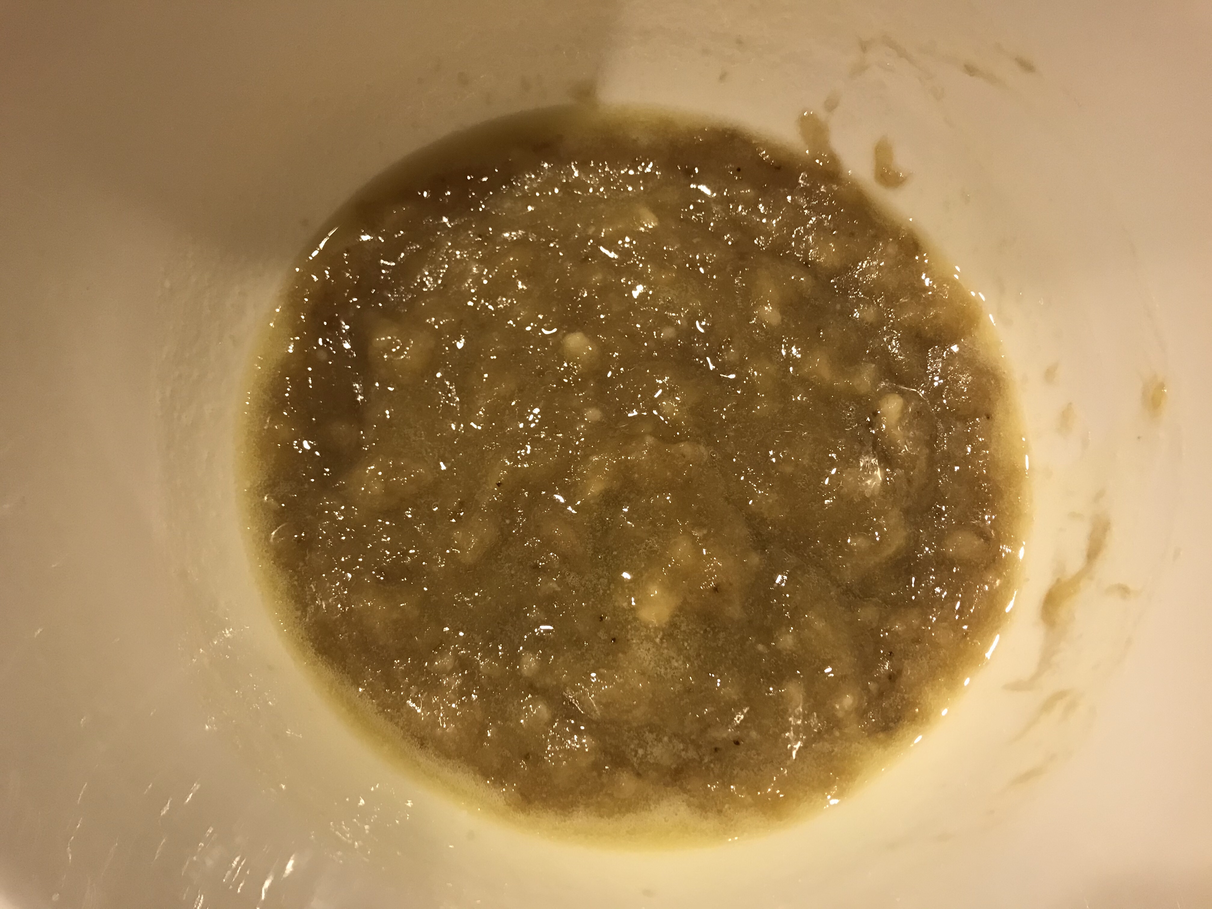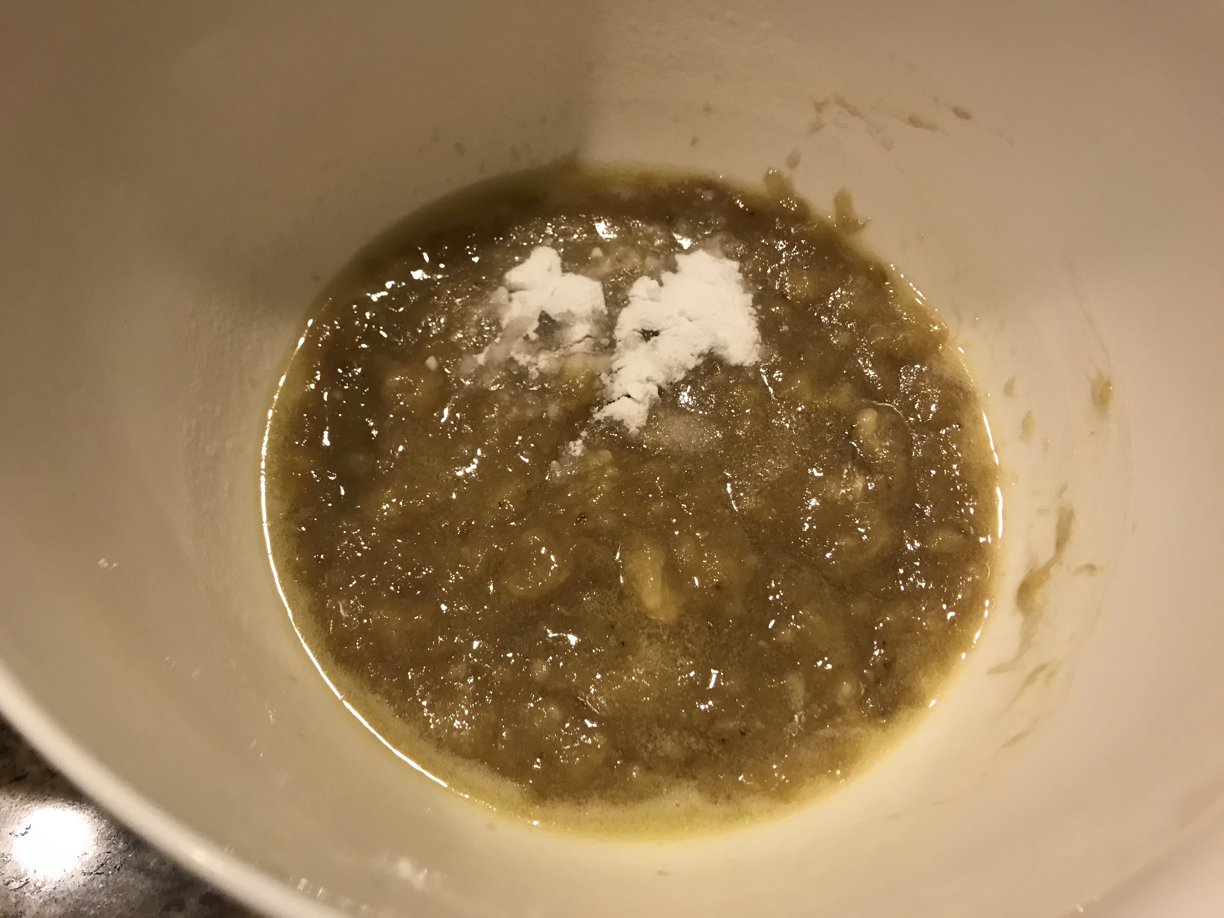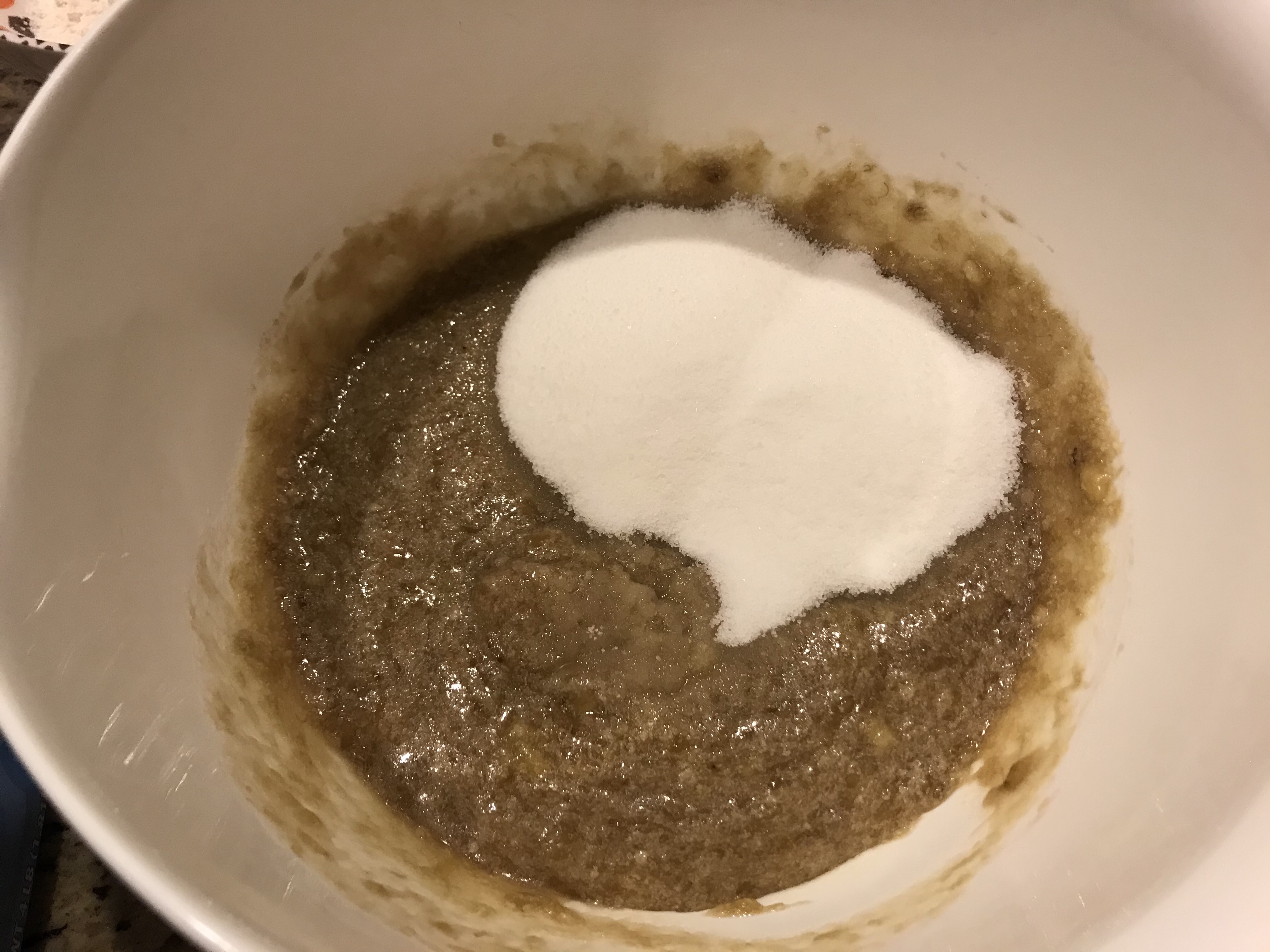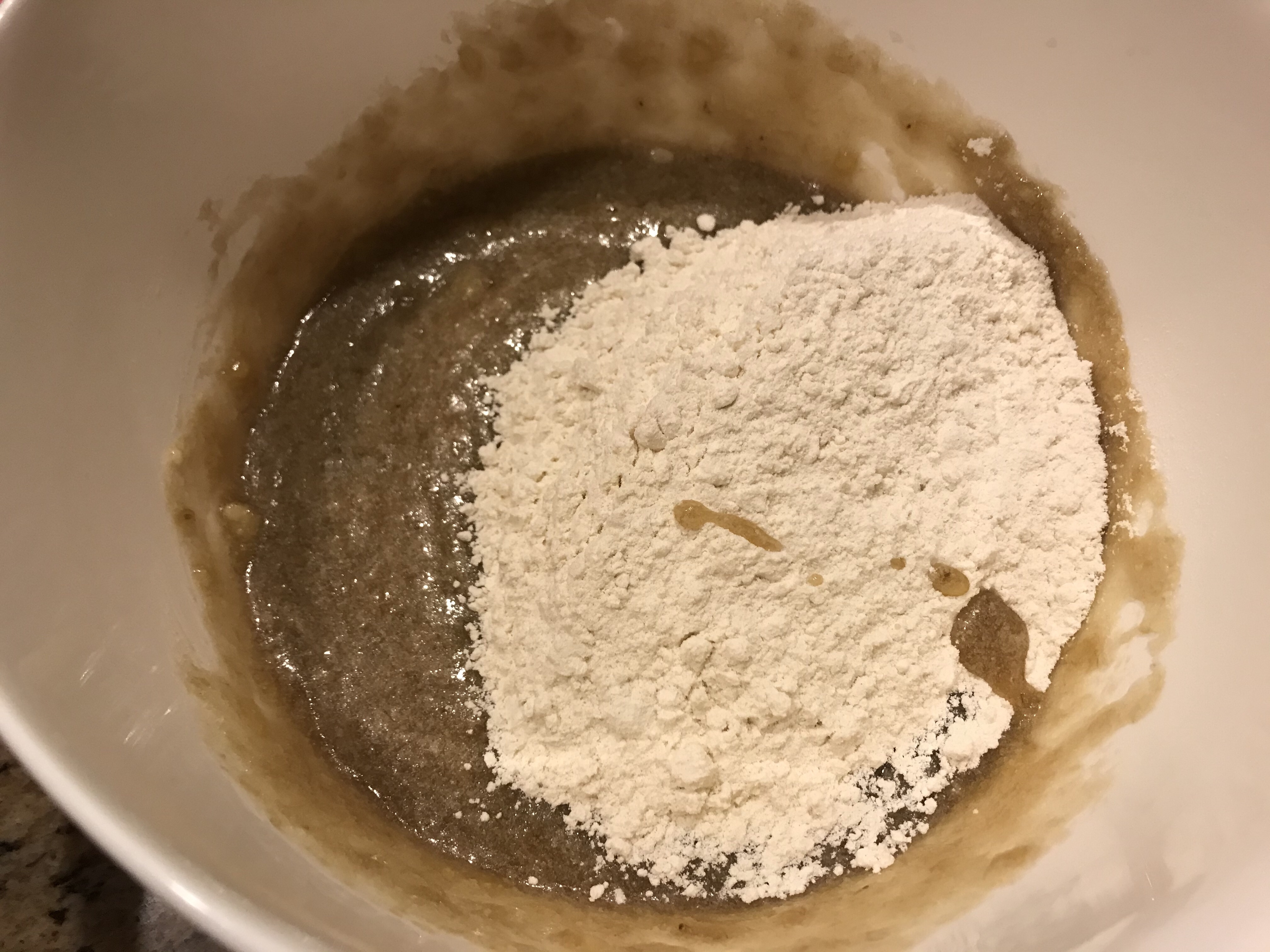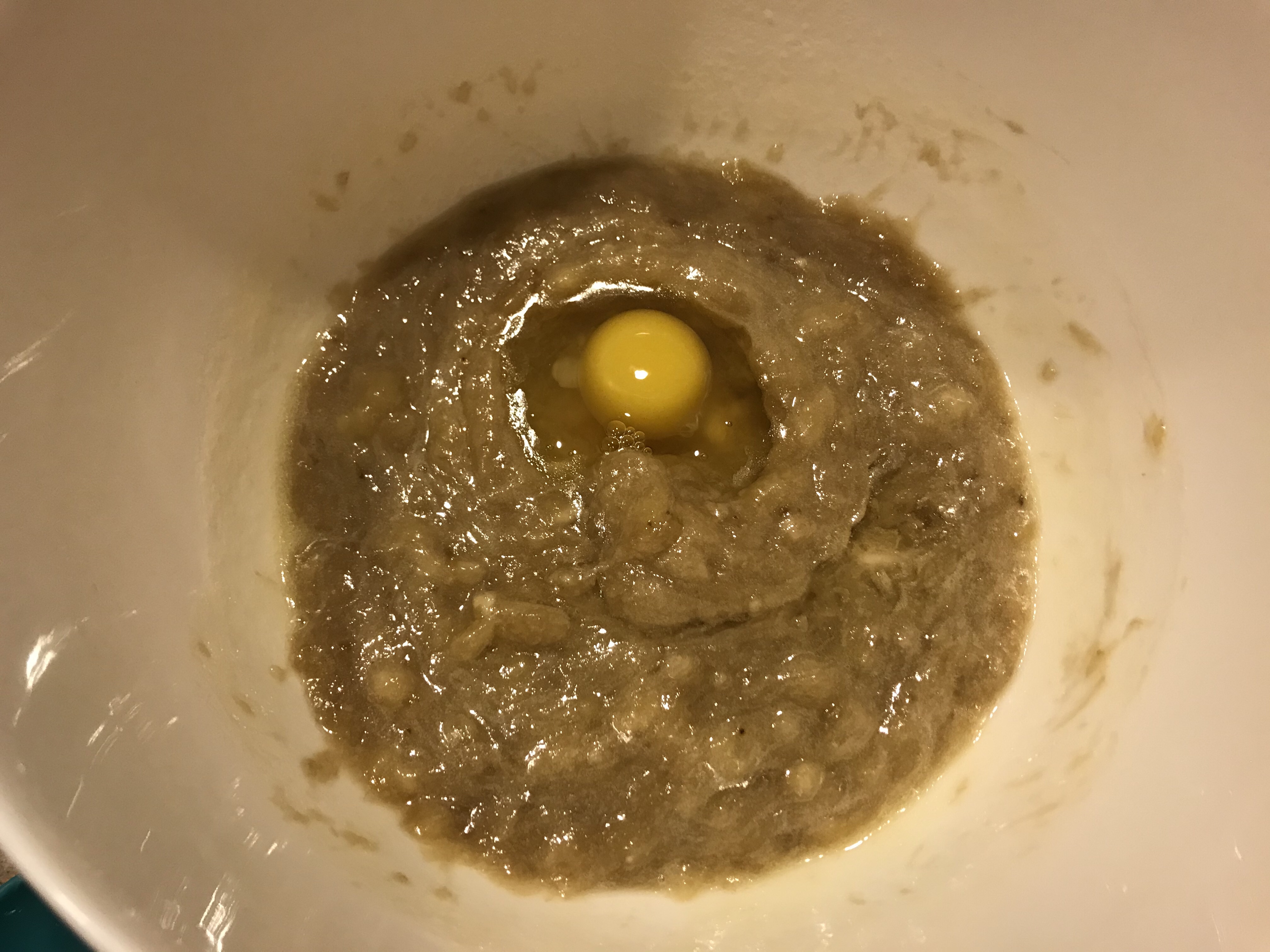 Mash bananas and add melted butter. You can just use a large spoon to mix, no electric mixer needed.