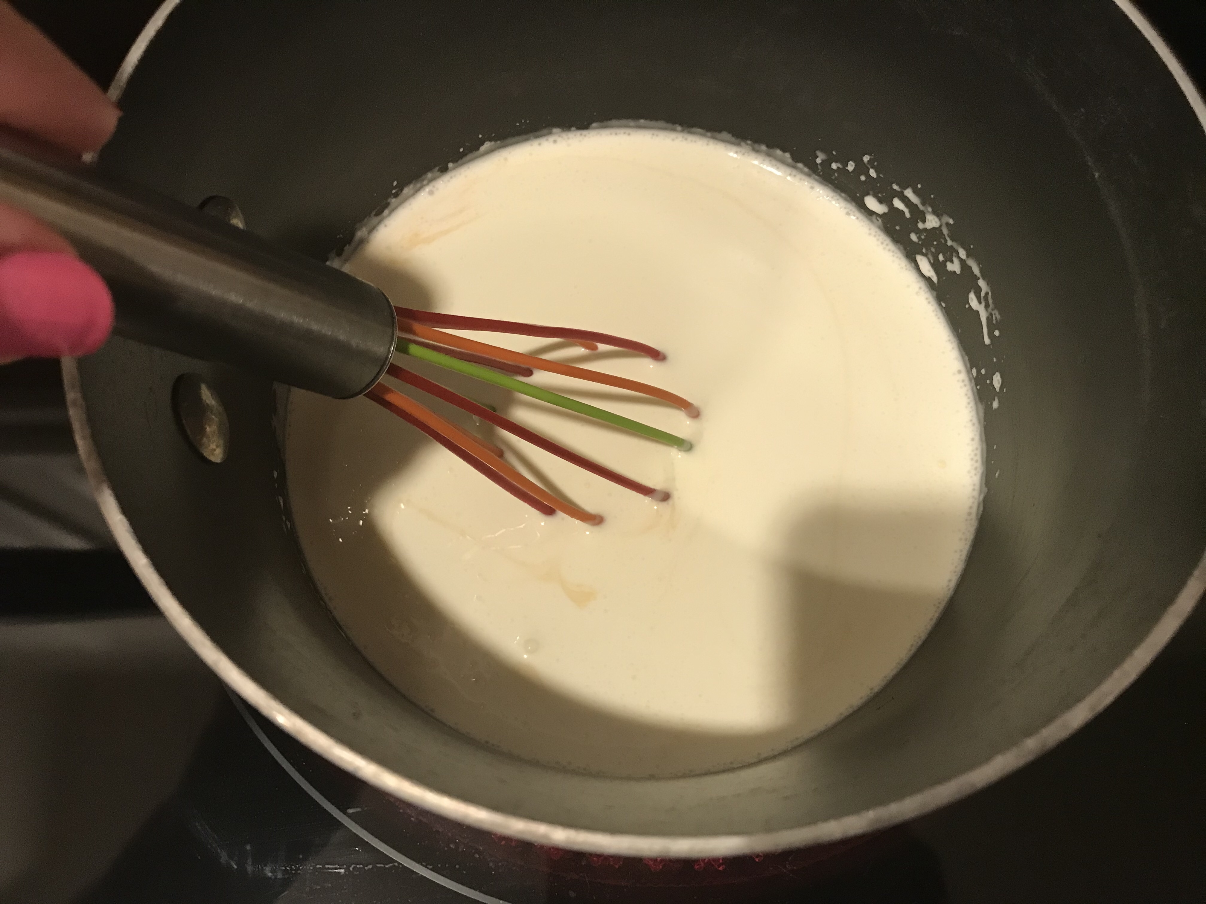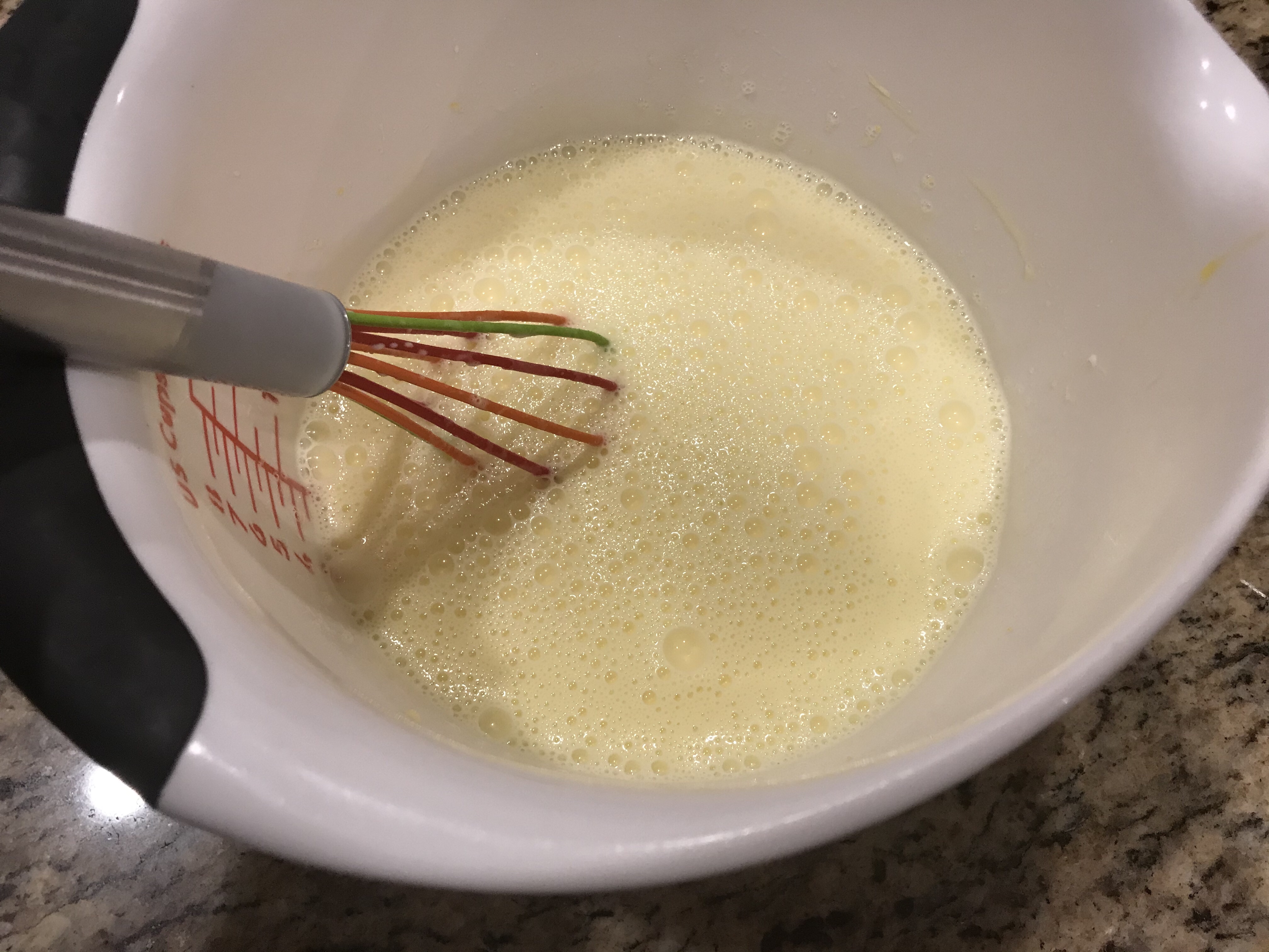 This next part is a little bit tricky. You need to add the hot cream, but you don’t want to scramble the egg yolks, so you need to temper it by pouring just a little bit of the hot cream in, whisking it together fast, and slowly pour the rest in, and whisk together. It will be a foamy consistency.