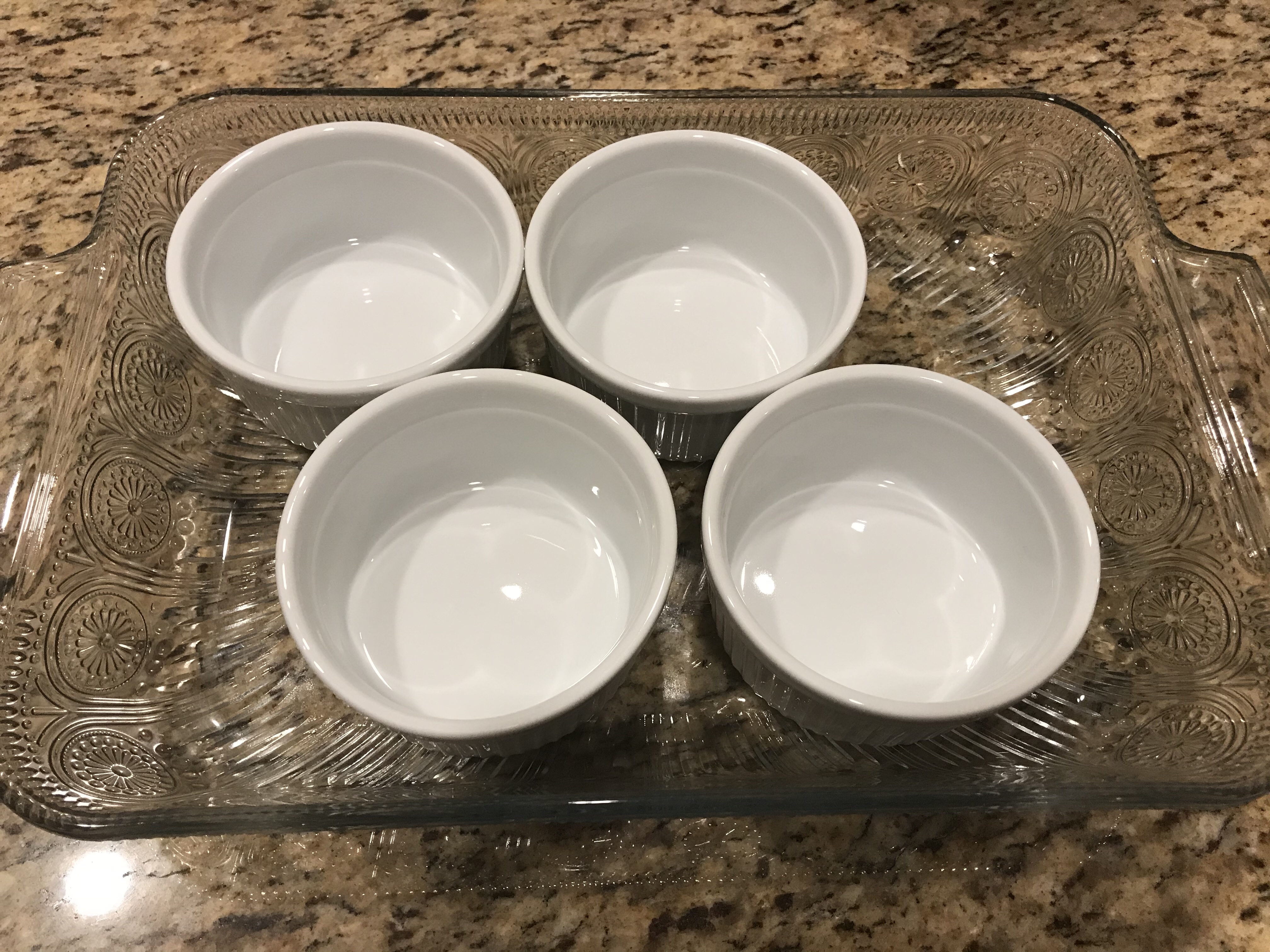 Next, we need to pour it into our ramekins, so place four of them into a baking dish.