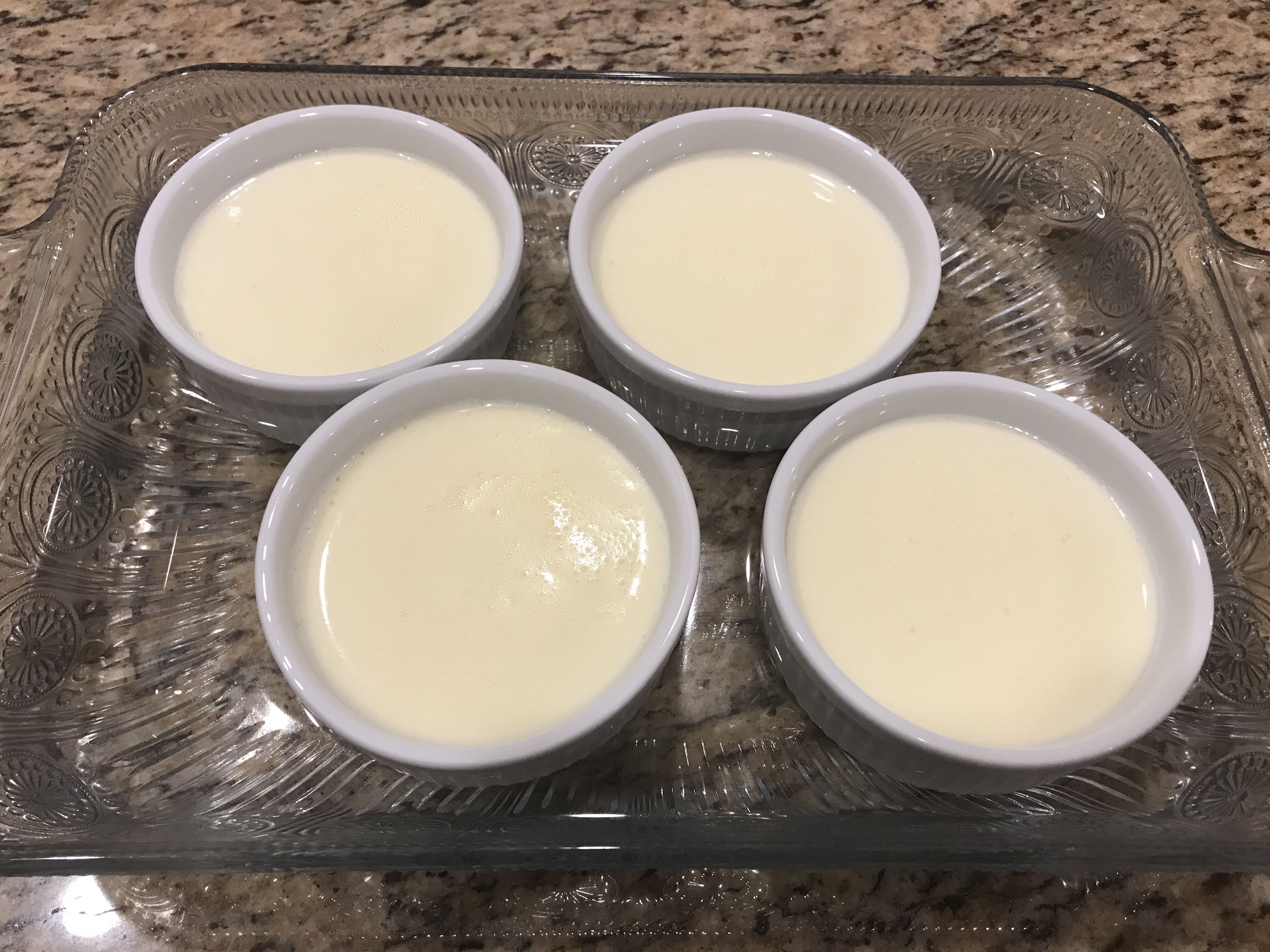Lastly, we are going to fill up the baking dish with boiling water. Pour it in only halfway up the ramekins. This prevents the custard from browning around the edges.