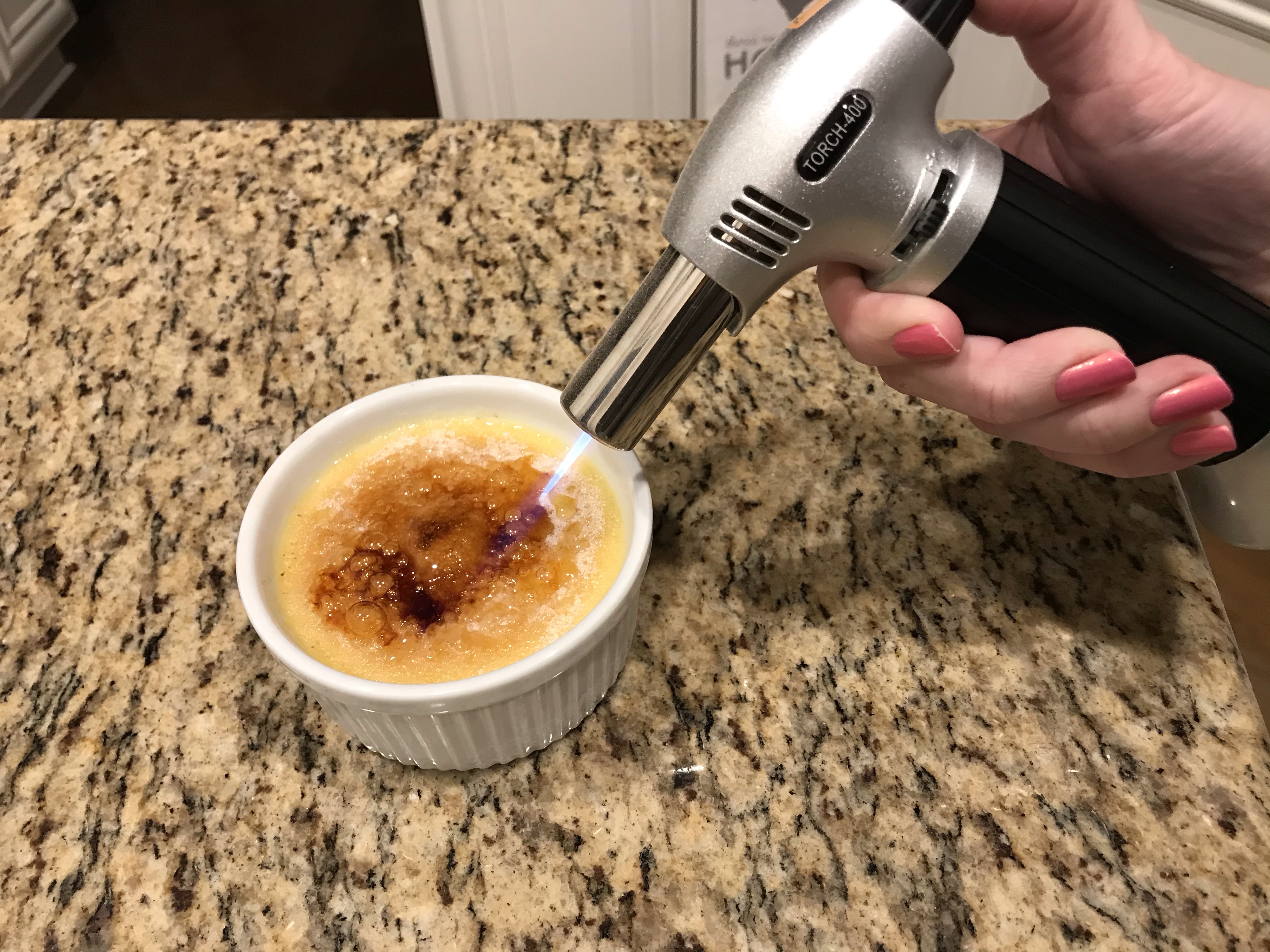 So, you need to refrigerate these (I always leave them overnight) so that they are really cold. When you are ready to serve them, take them out of the fridge, sprinkle some sugar on top, and torch ’em. Torching them makes that crunchy caramelized sugar top that is OH SO delicious.