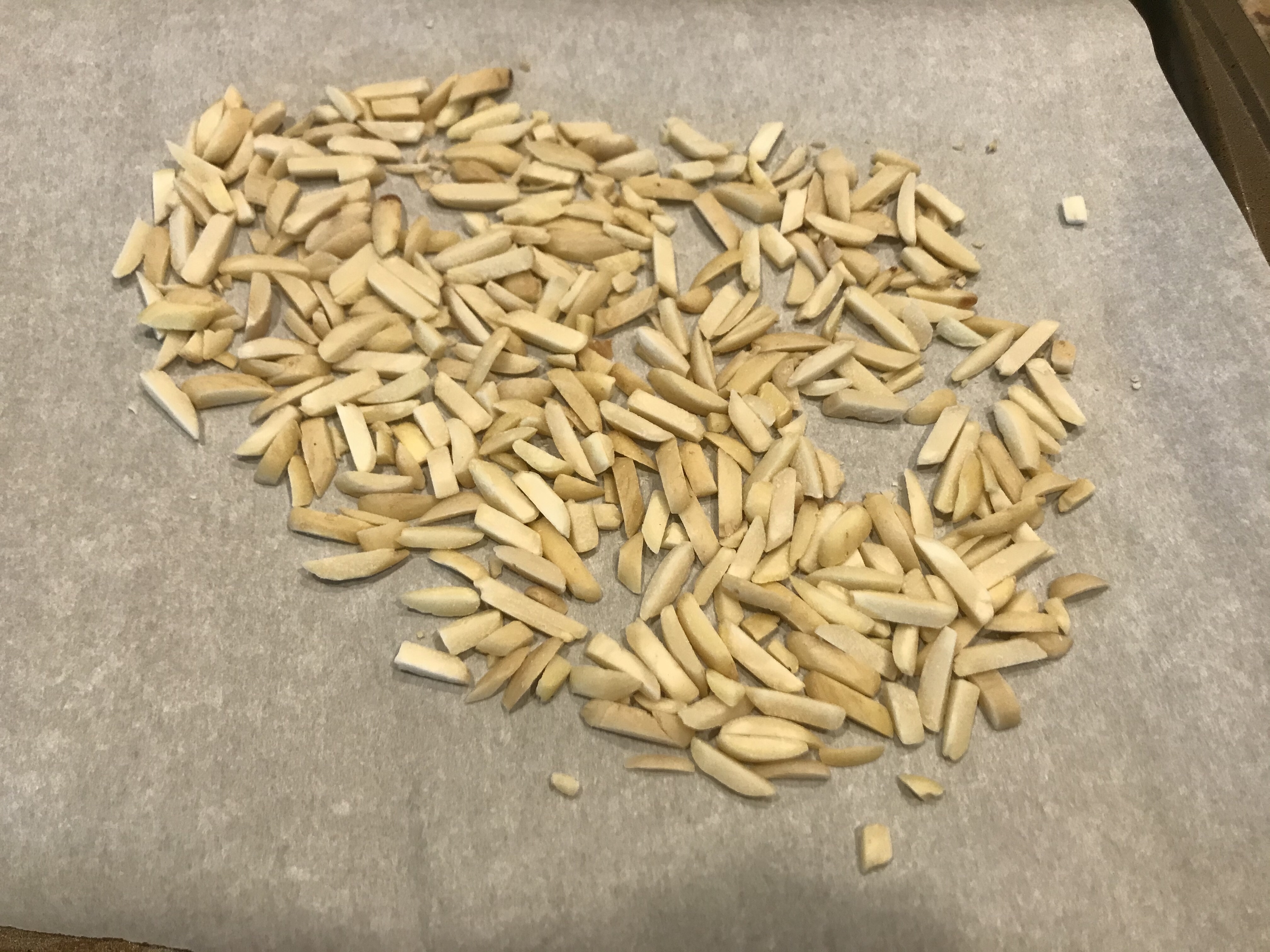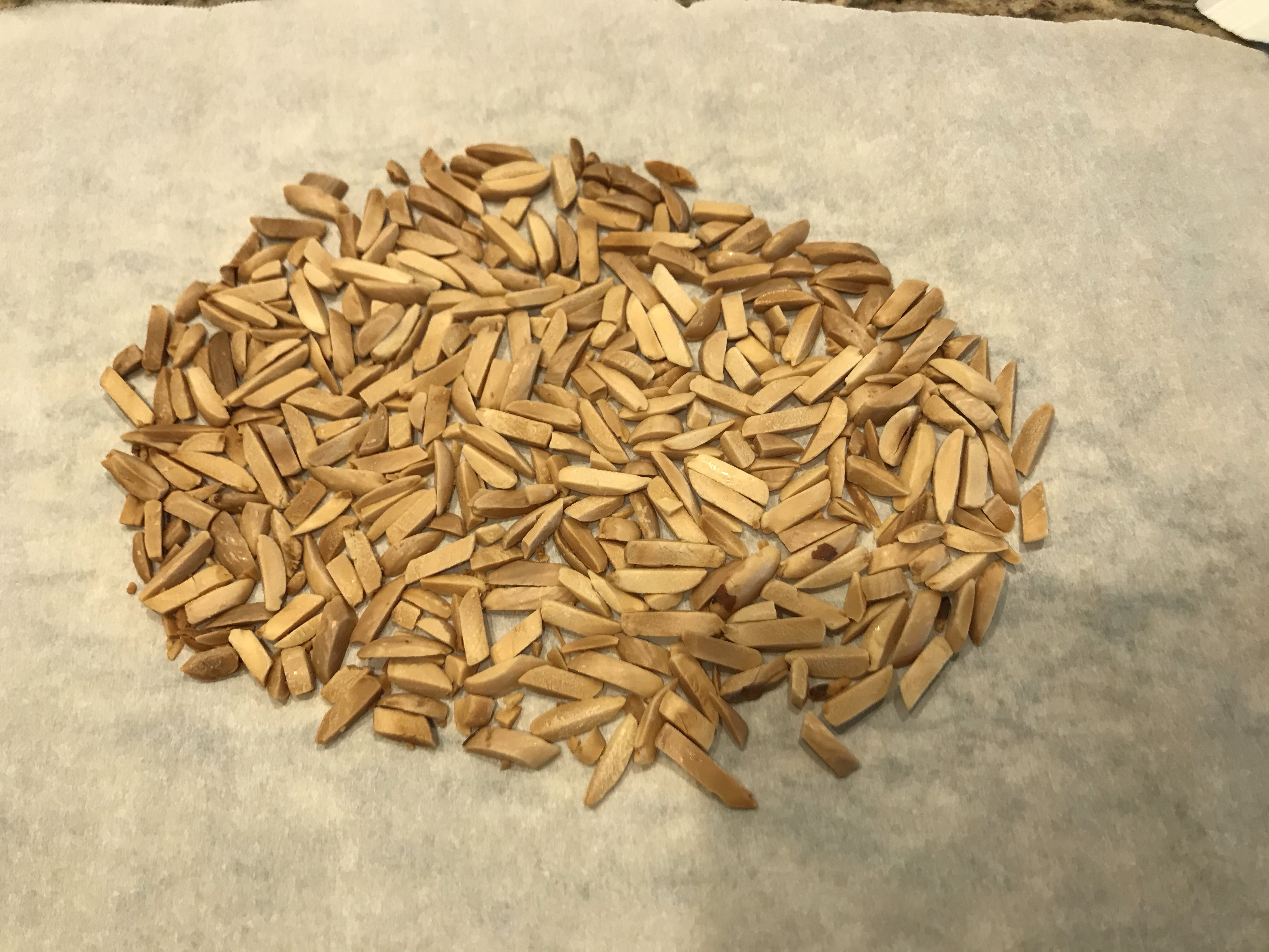 First, we need to toast the almonds. This MAKES the green beans. Preheat oven to 350 degrees and place almonds onto a baking sheet. Bake for about 5-7 minutes or until they are slightly brown. Toasting is necessary.