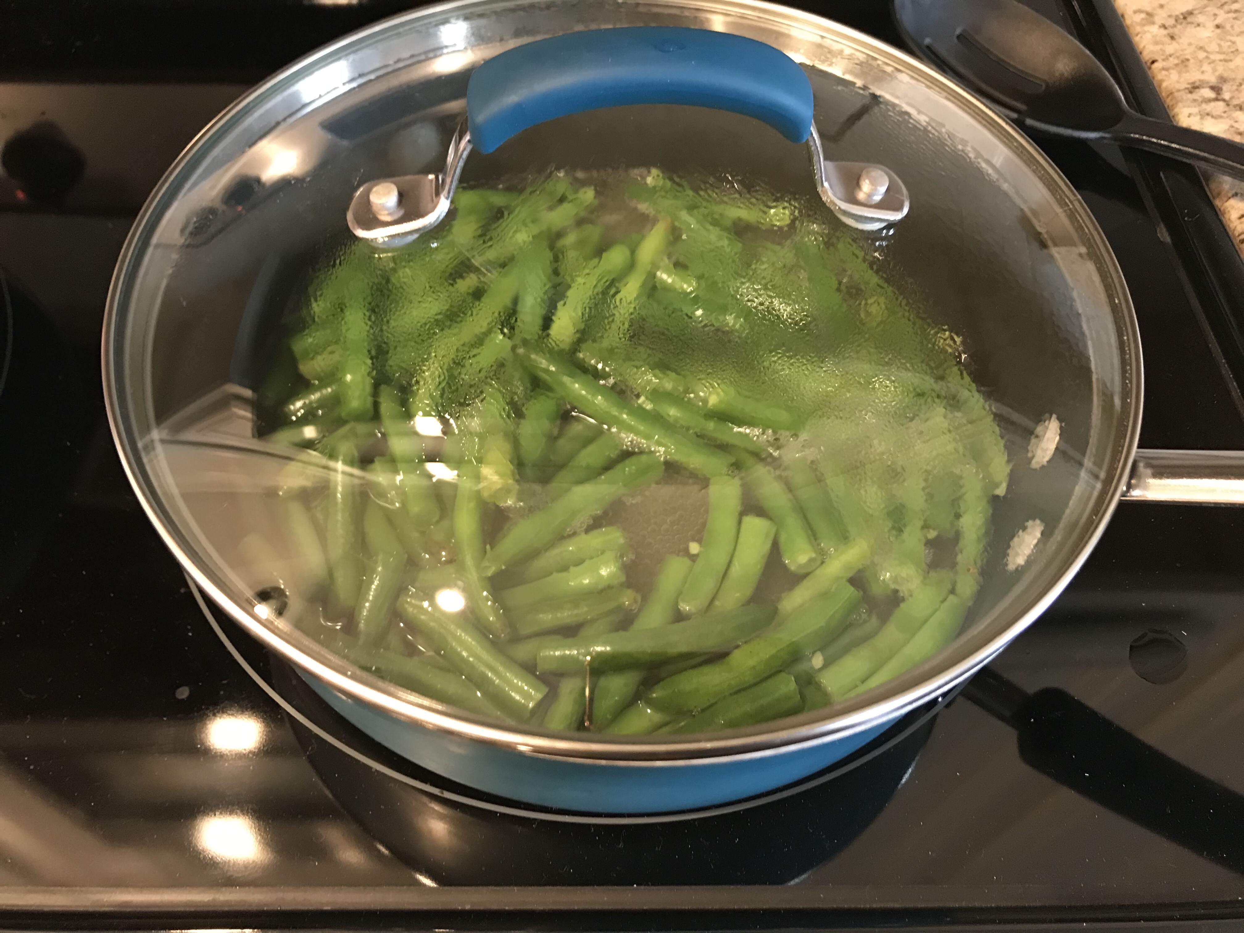 Add the green beans in, and then lower the heat to simmer and cover them.