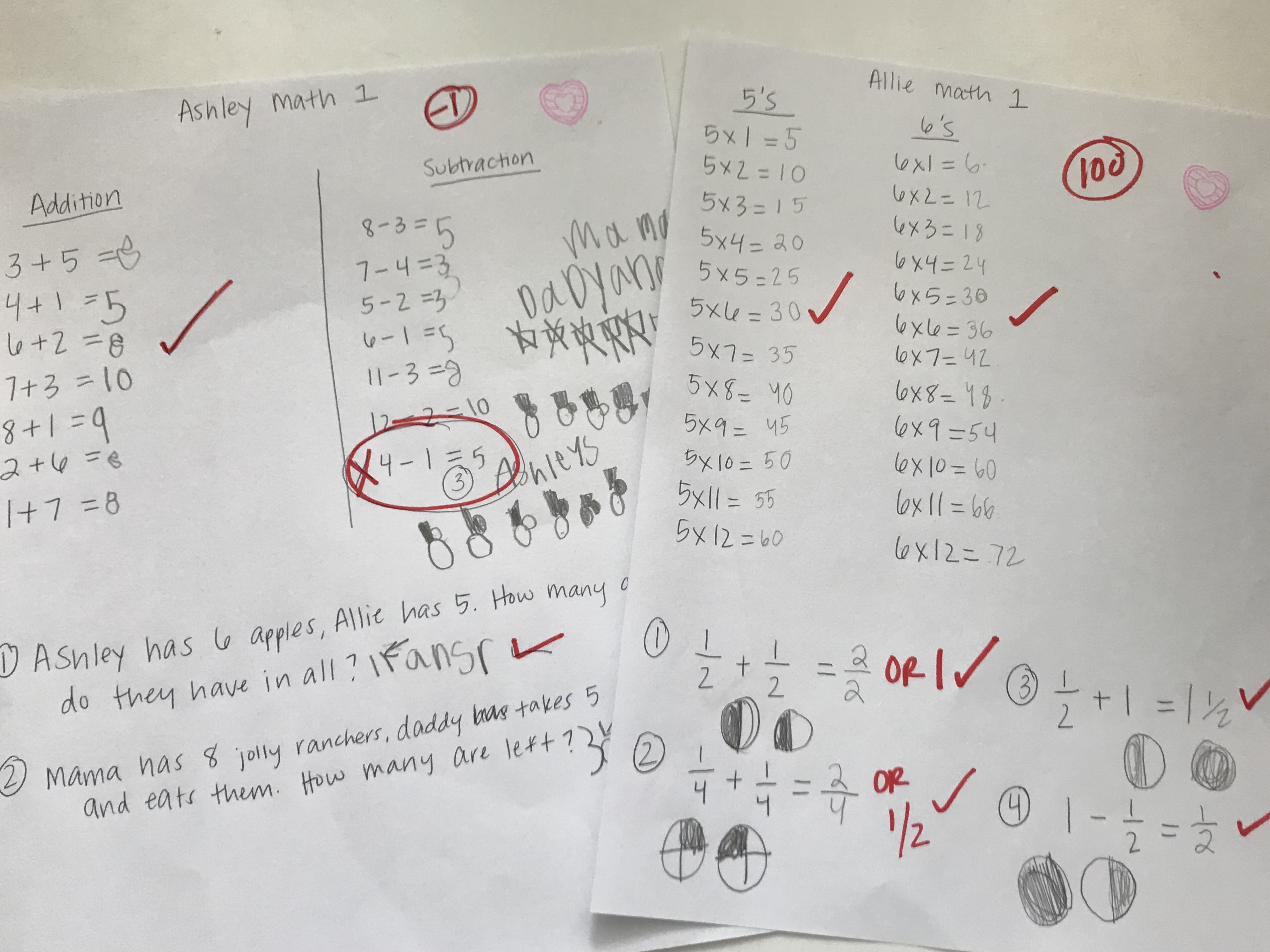 I make them up worksheets to do for the math time block. Allie is working on multiplication/fractions, and Ashley is working on adding/subtracting/word problems. We grade the worksheets together when they are finished. Also, my 8 year old likes to use our dry erase board to give Ashley some math problems, so we do that too.