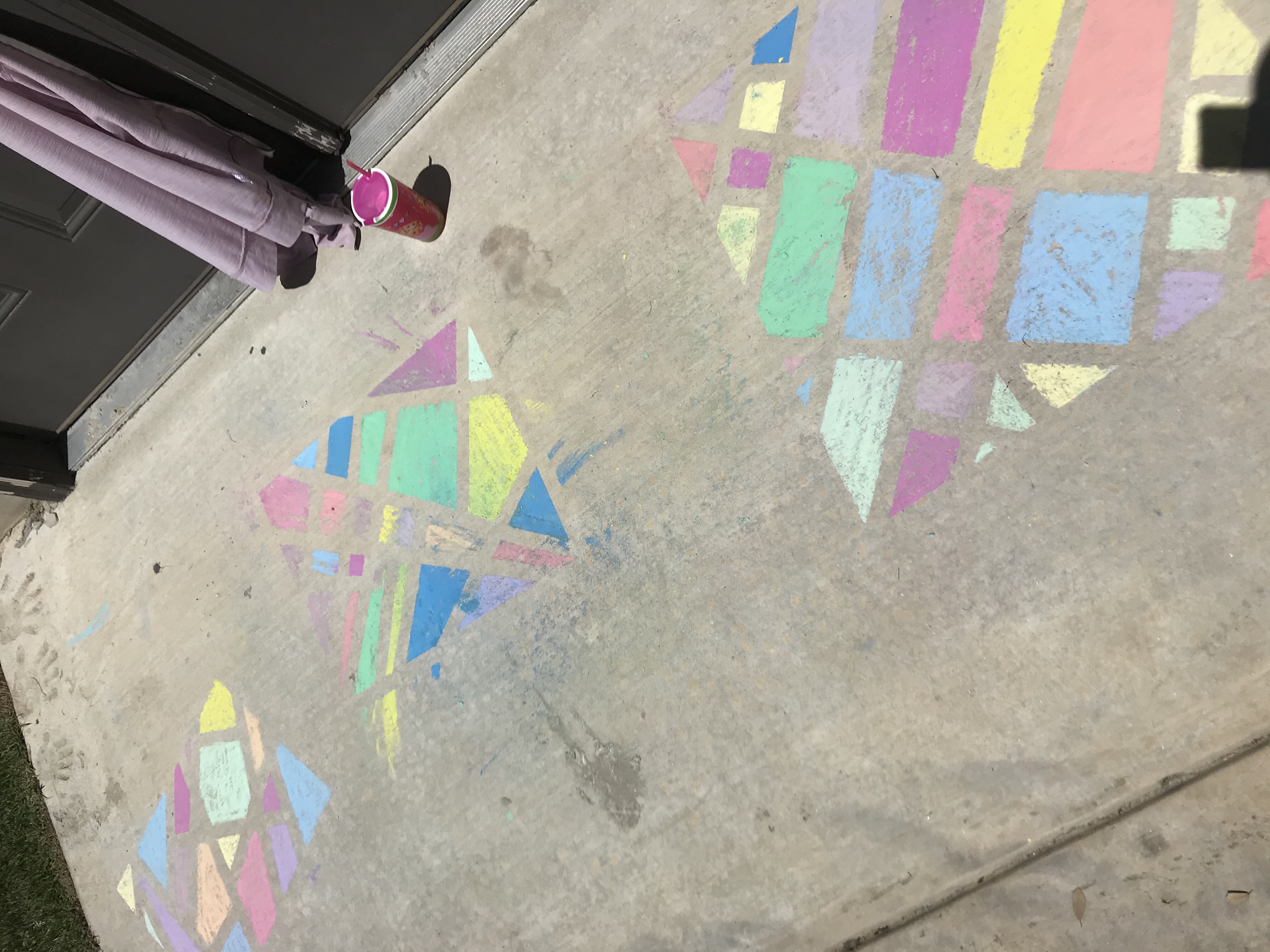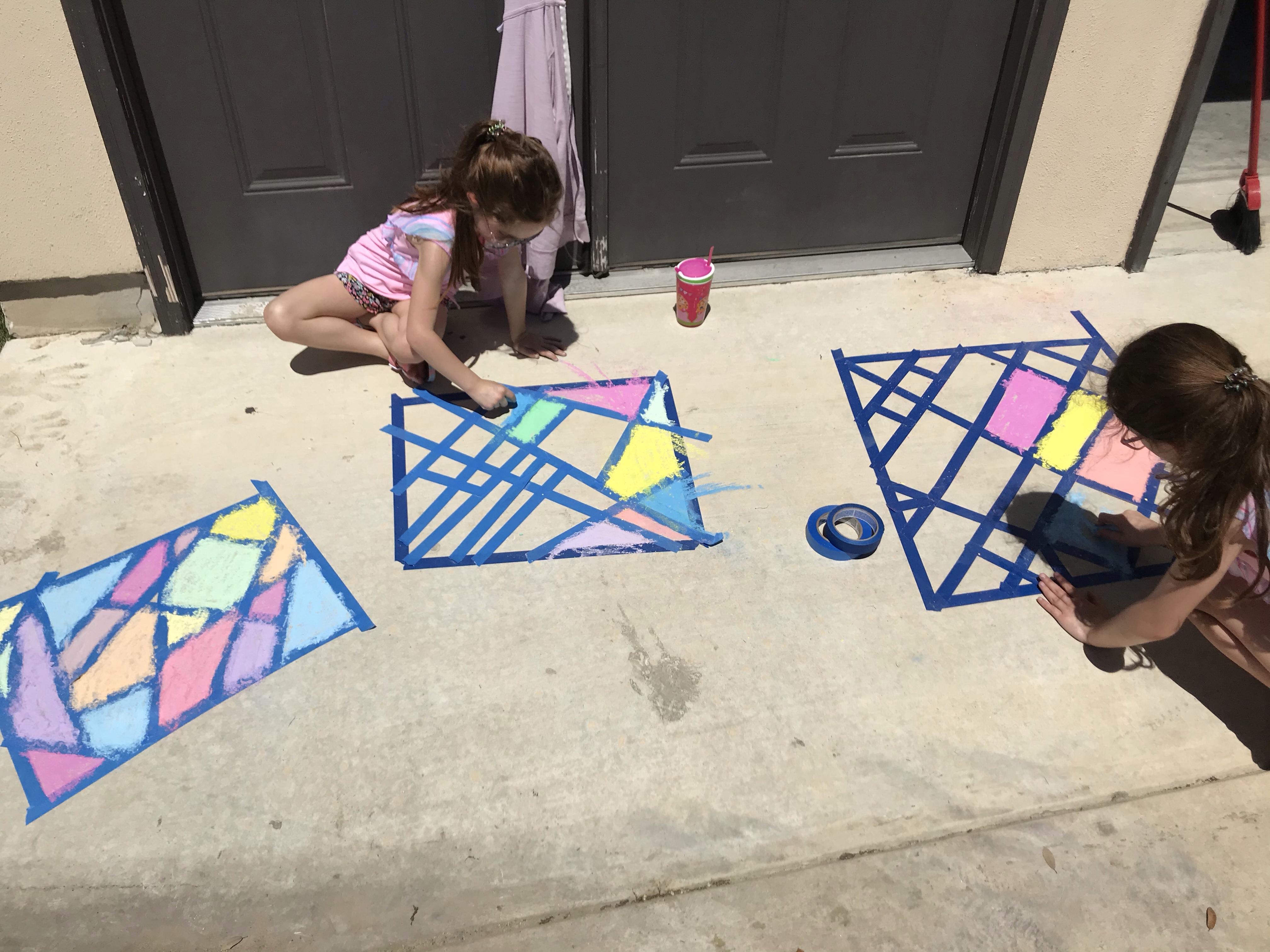 It was such a pretty day outside, so the girls rode their scooters, jumped on the trampoline, and we did a little activity using painters tape and sidewalk chalk.