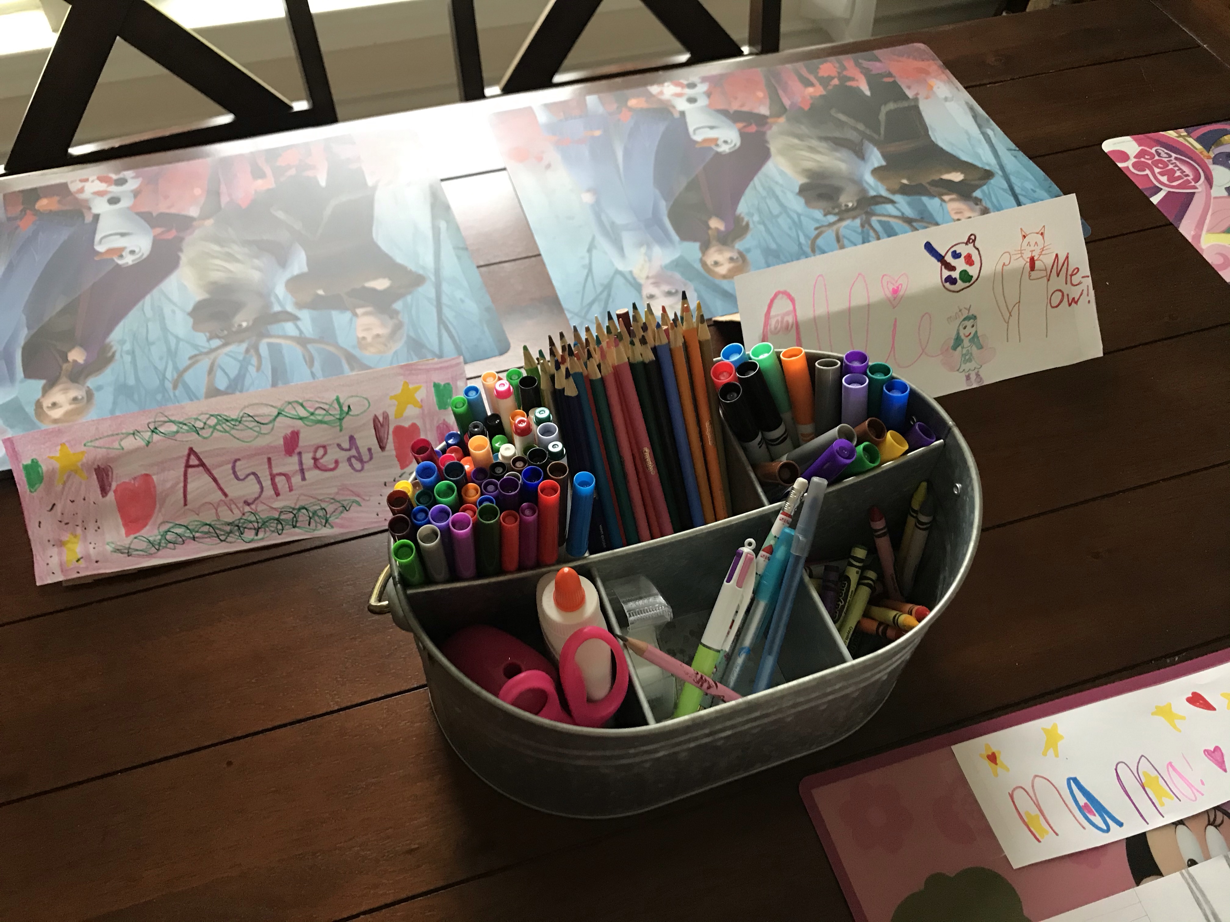 We turned our table in the dining room into a school table, since the one in the playroom wasn’t big enough. Who uses a formal dining room anyway?