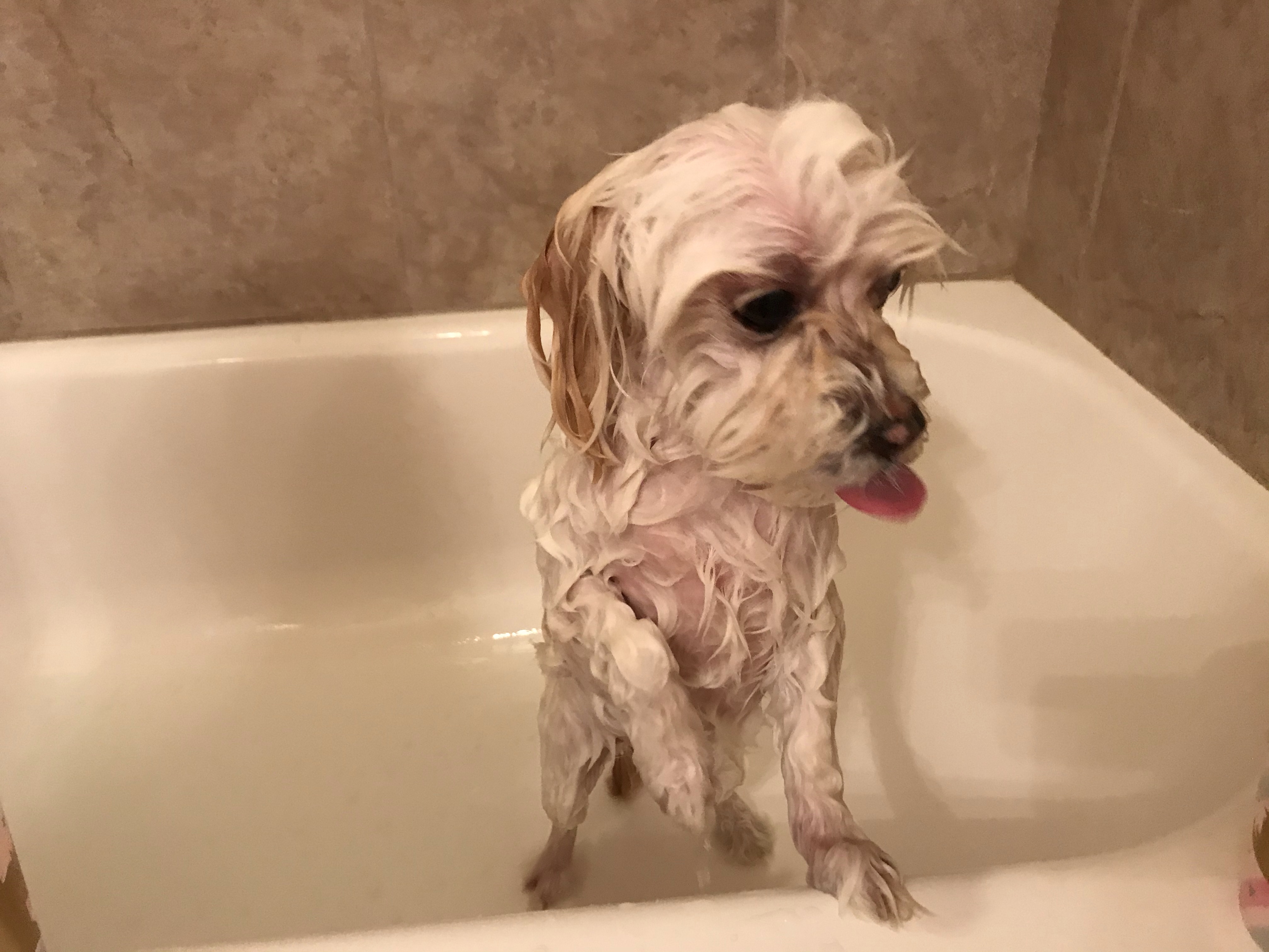 While she was doing that, I gave our dog Mollie a bath. She is a 10 year old maltese. She lives inside the house, so a bath every week is a must! I also brush her.