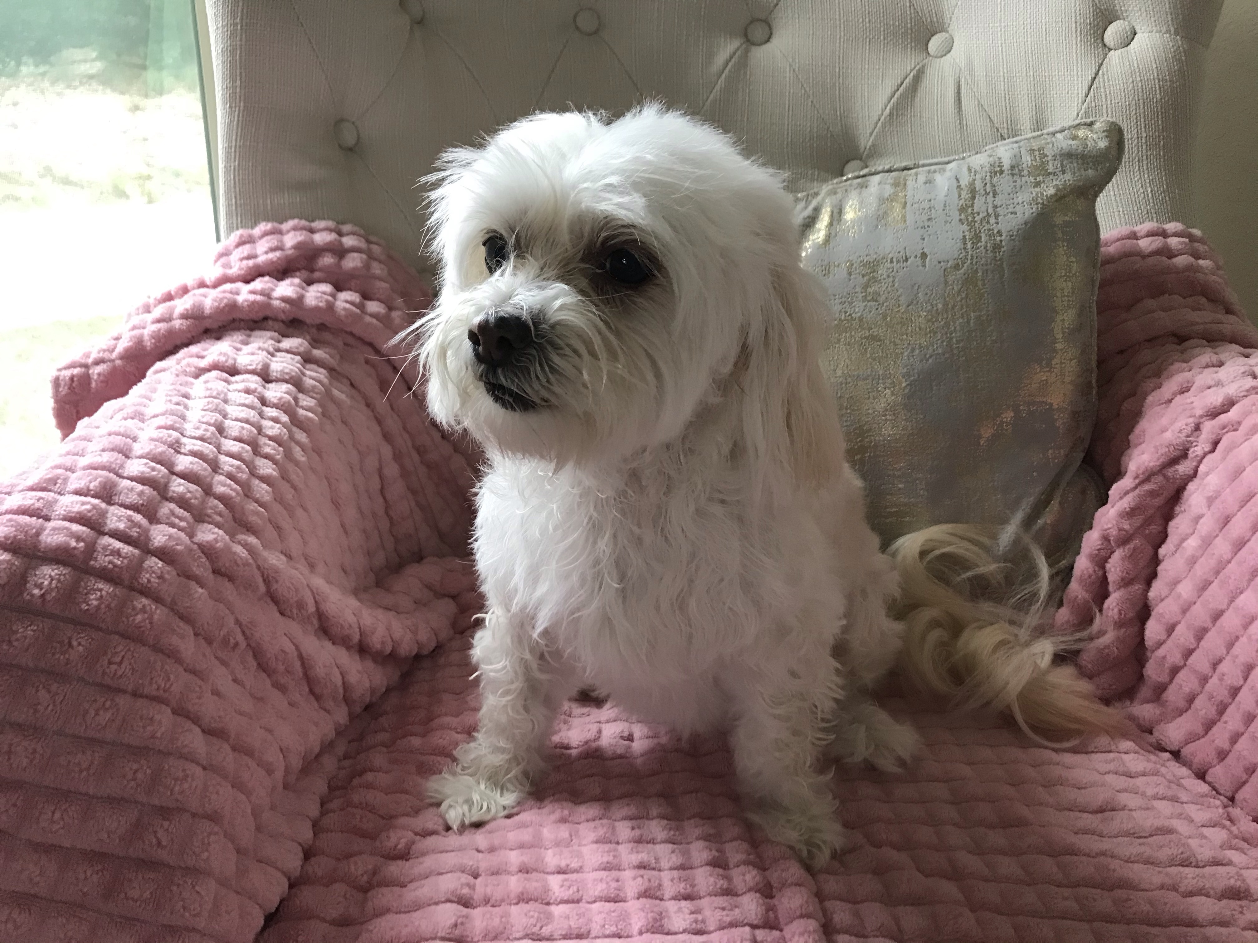 After I bathed and brushed her, it was back to her chair to look out the window at the cows!
