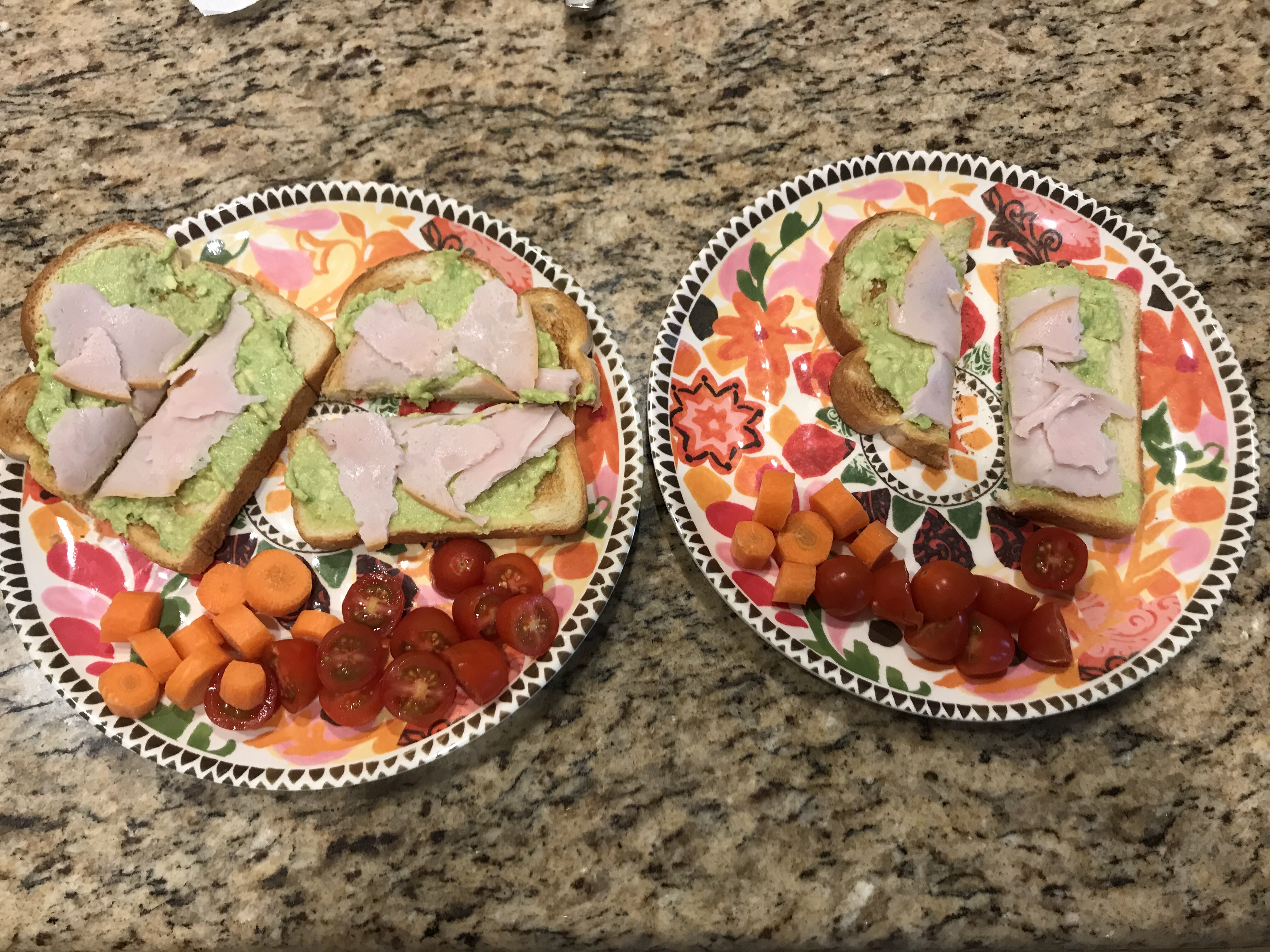 I spread some avocado on toasted bread, and topped it with a little garlic salt and some turkey. They also had some cherry tomatoes and carrots to go with it.