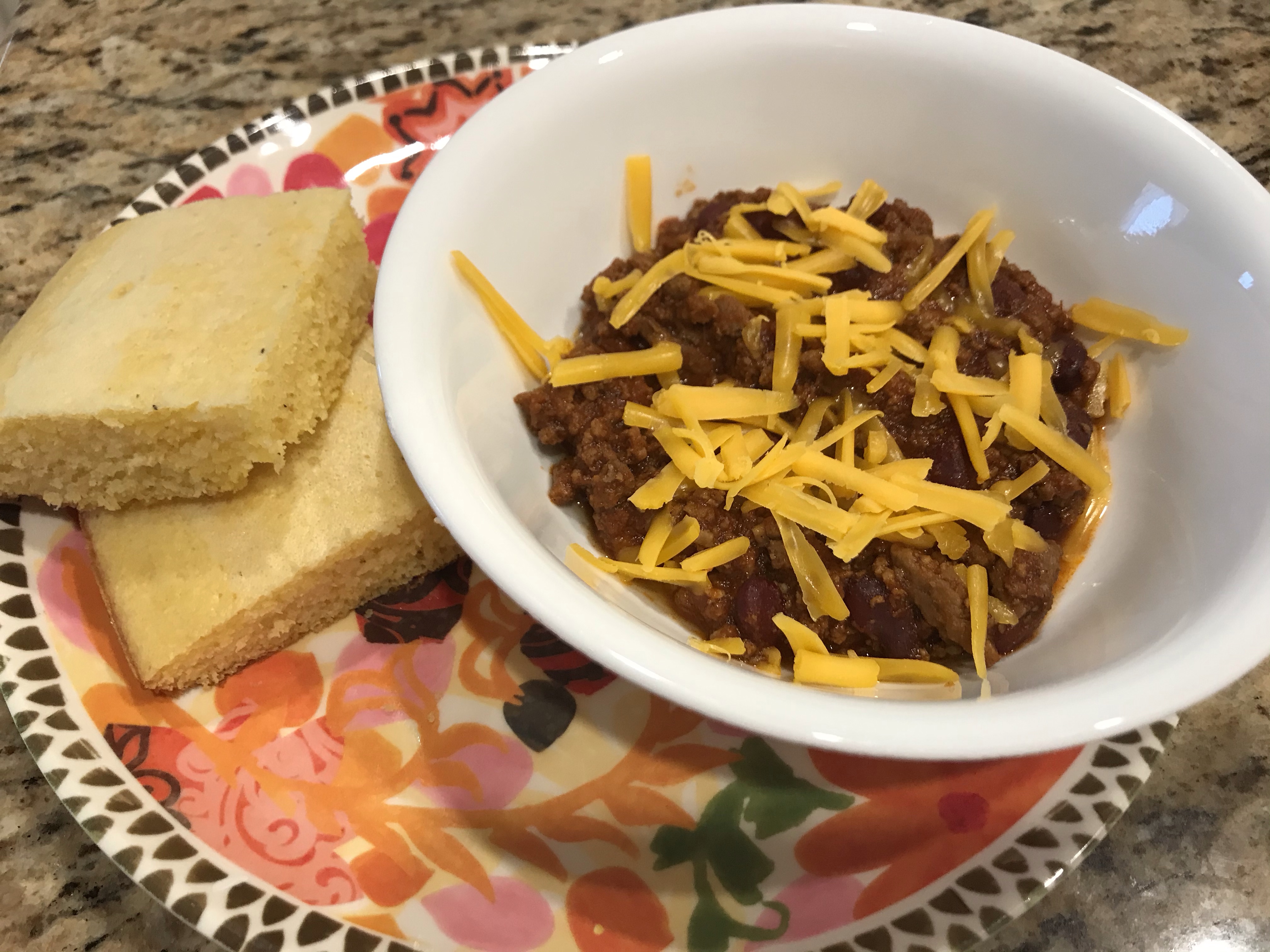 I start making dinner at this time, so since the crockpot was making the chili, all I had to do was make some cornbread to go with it!