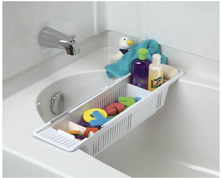 My girls are 9 and 6, so they are shower-takers now! My littlest cannot reach the built in wall nooks that hold the shampoo/conditioner/soap, so I picked up this little caddy! This goes over the tub and is fully adjustable! It is super easy to assemble and holds all of the products in it so that she can reach them. It would also be so good for bath toys!