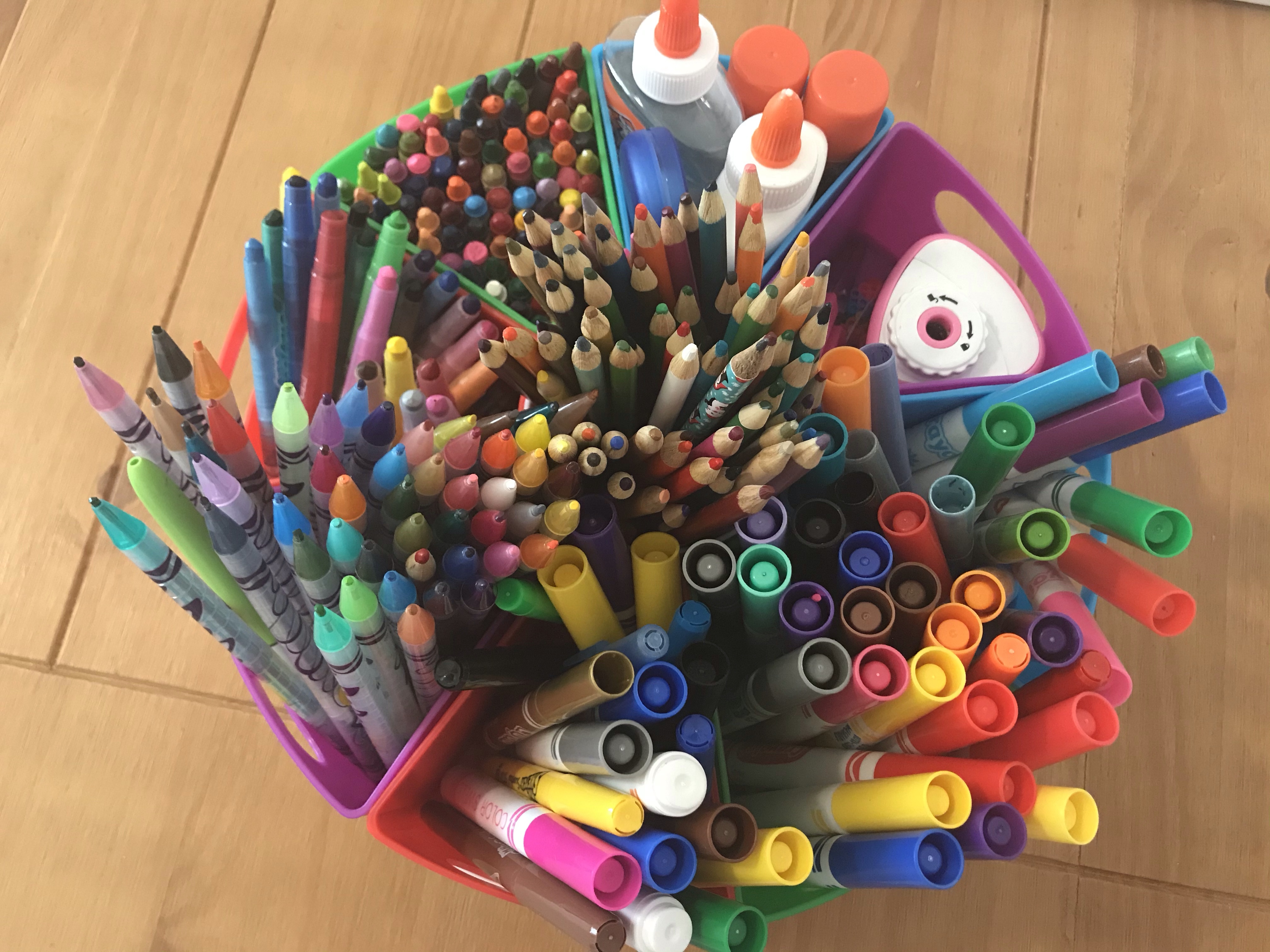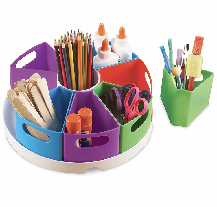 This arts and crafts caddy is such a space saver! We have every marker, map pencil, and crayon out there, so we needed a way to organize. This thing is HUGE, and holds everything we need. I also LOVE how you can remove each section depending on what you are using. Here is ours on our craft table in the playroom! It is chock full.