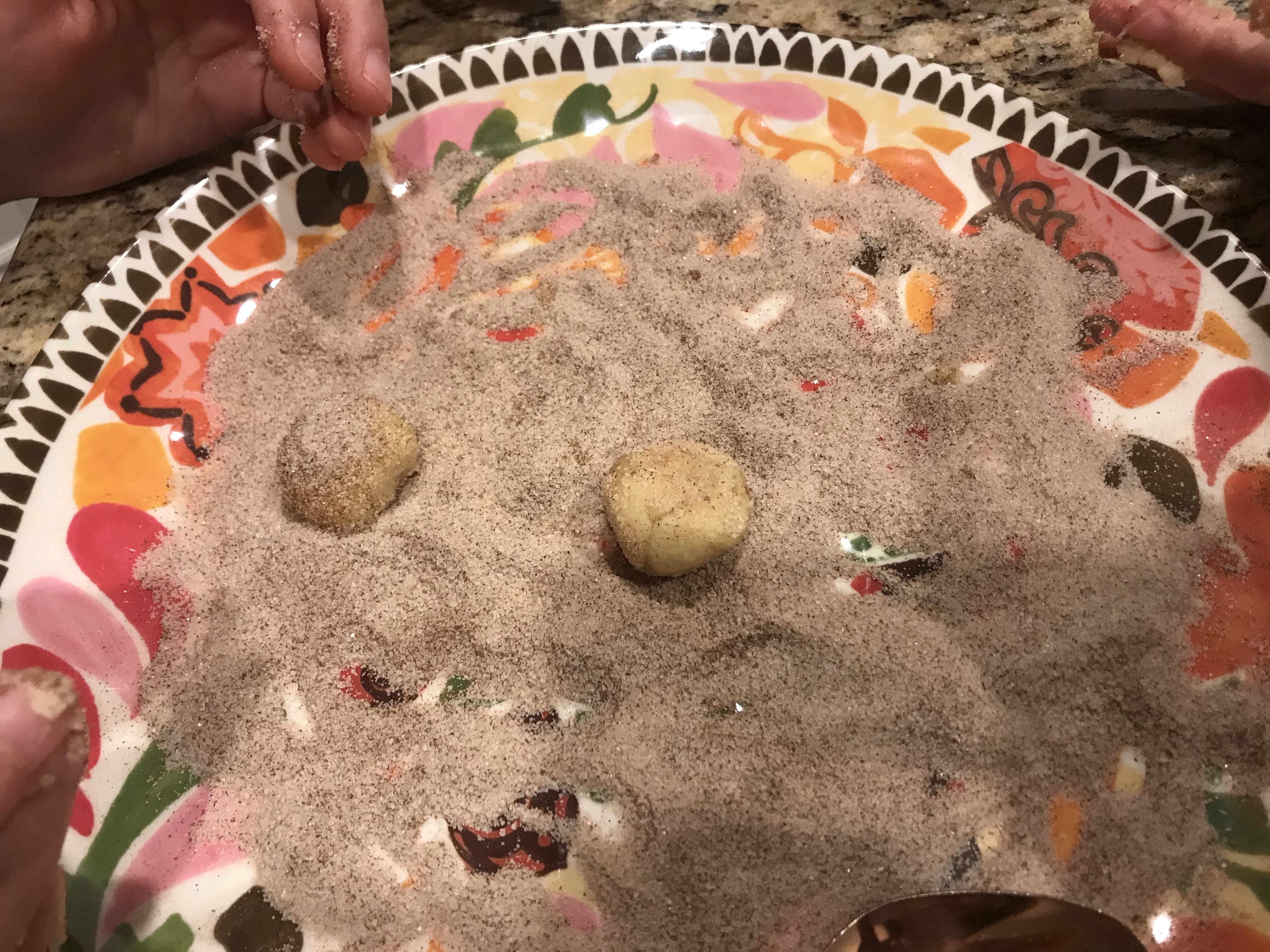 Roll into balls and coat with cinnamon sugar. My girls like to help with this part!