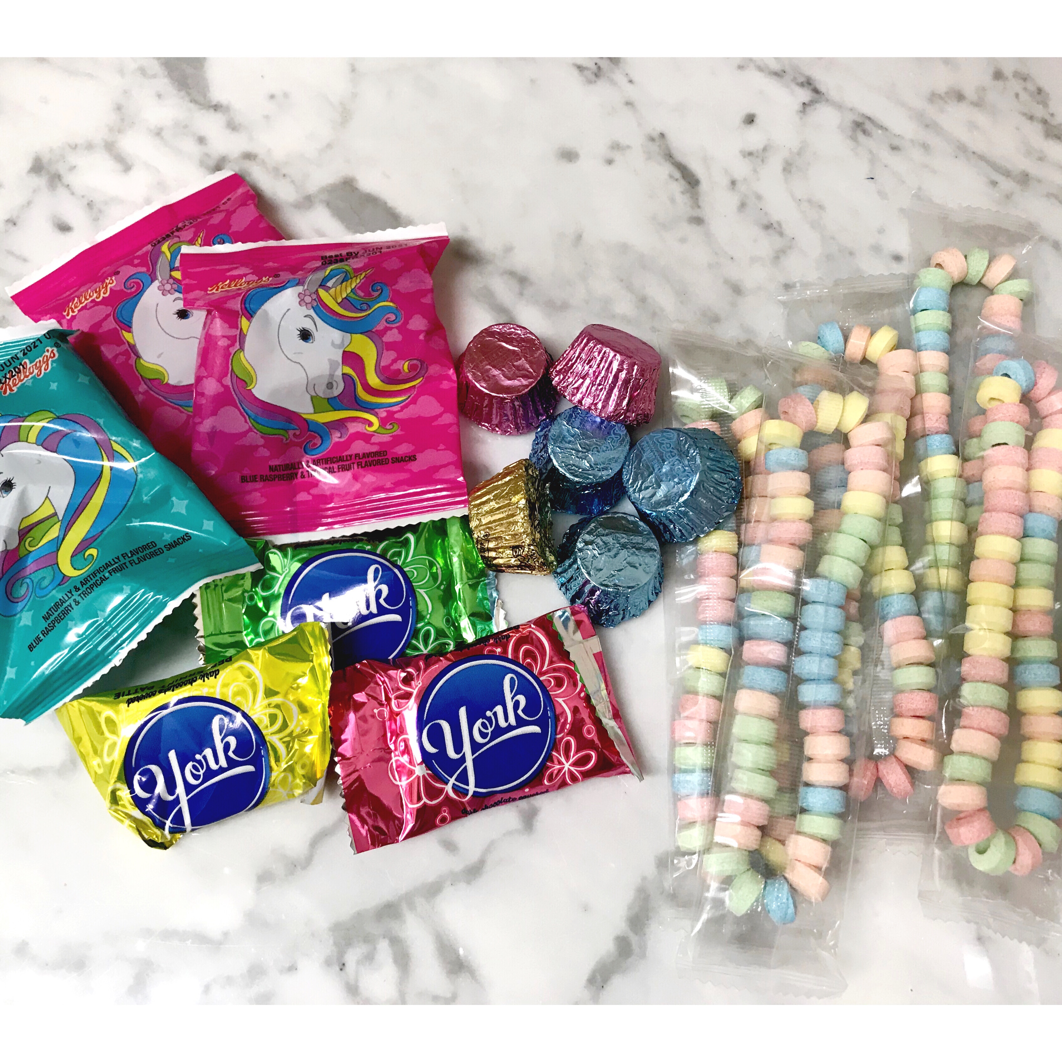 I got some unicorn fruit snacks, Reese’s cups, York peppermint patties, and candy necklaces. All easily fit into the eggs.