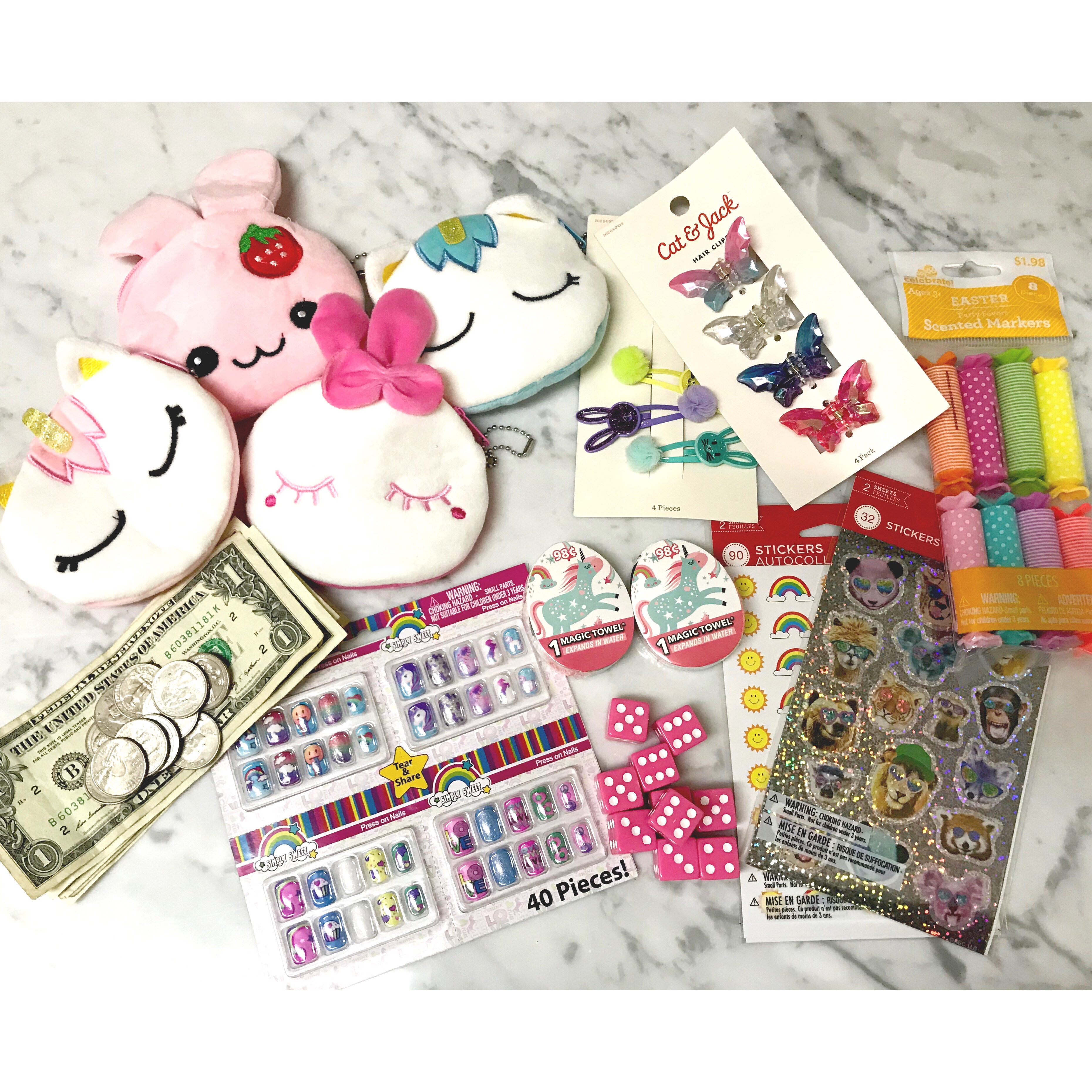I also found some bunny hair clips, some butterfly claw clips, small scented markers that look like candies, and press on nails.