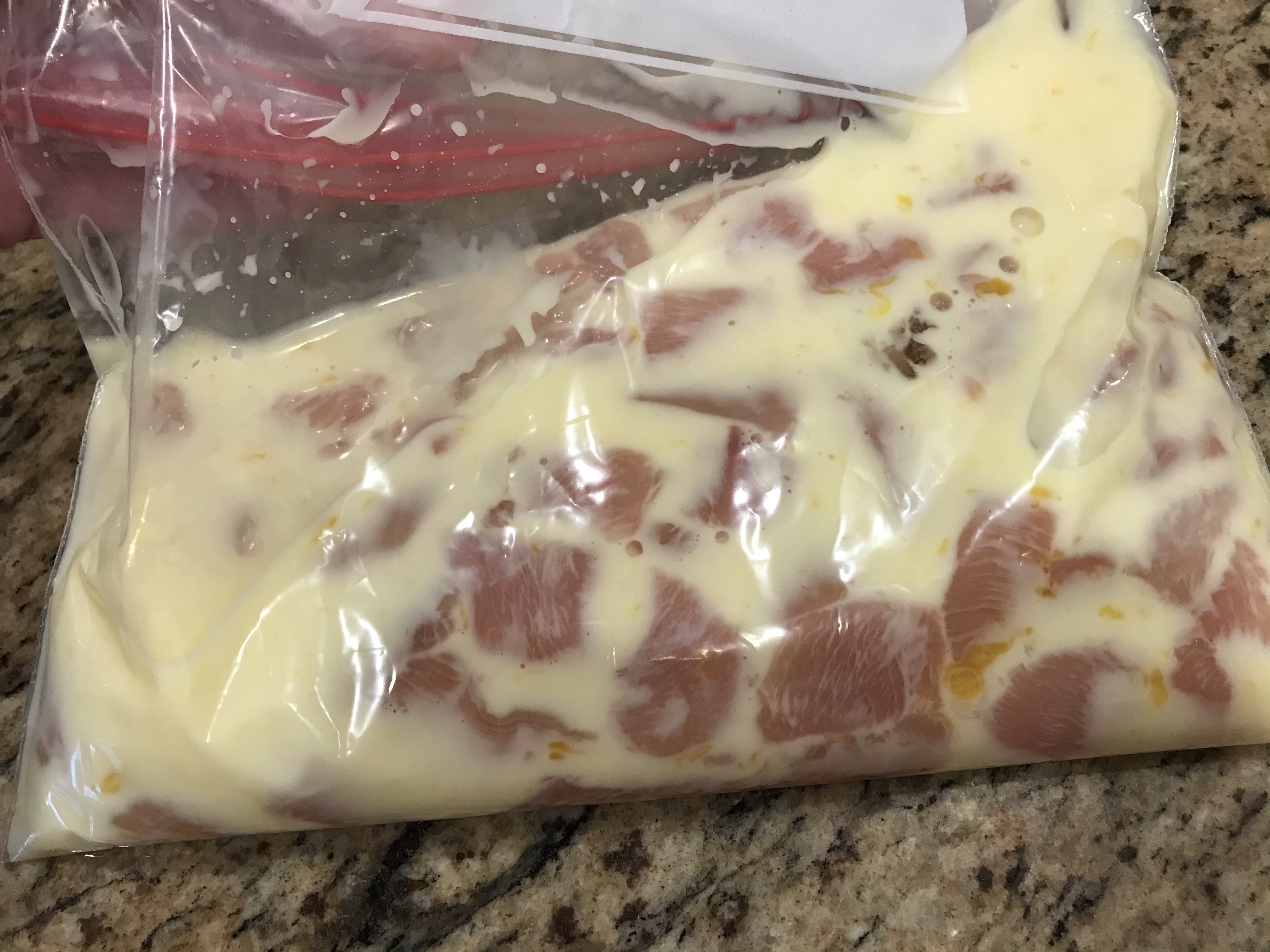 Next you’re going to mix together your milk, eggs, and chicken chunks and put them into a big ziplock.