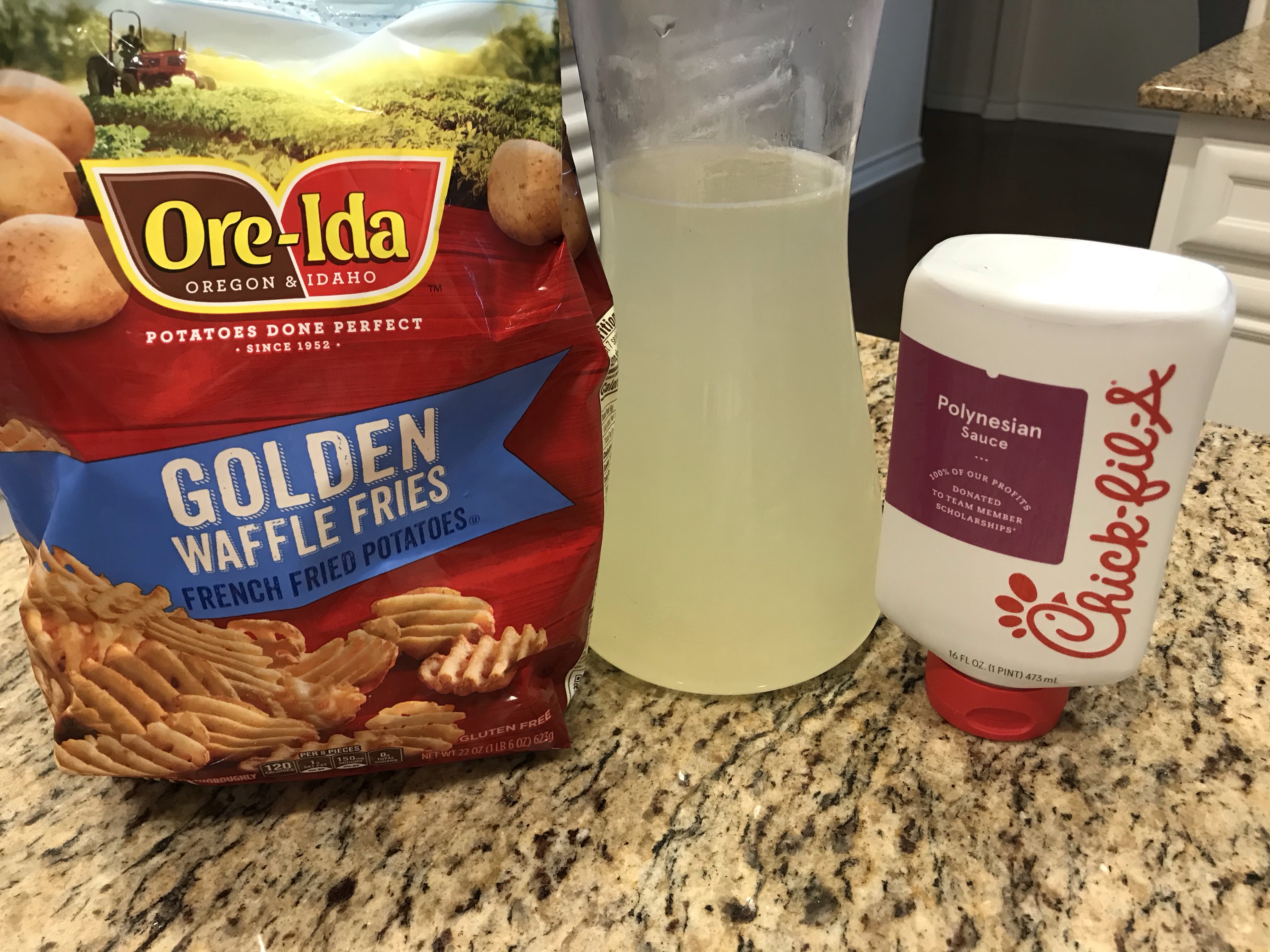 Waffle fries, lemonade, and we love the Polynesian sauce. They sell this sauce at my local H‑E‑B! I think they sell CFA sauce too.