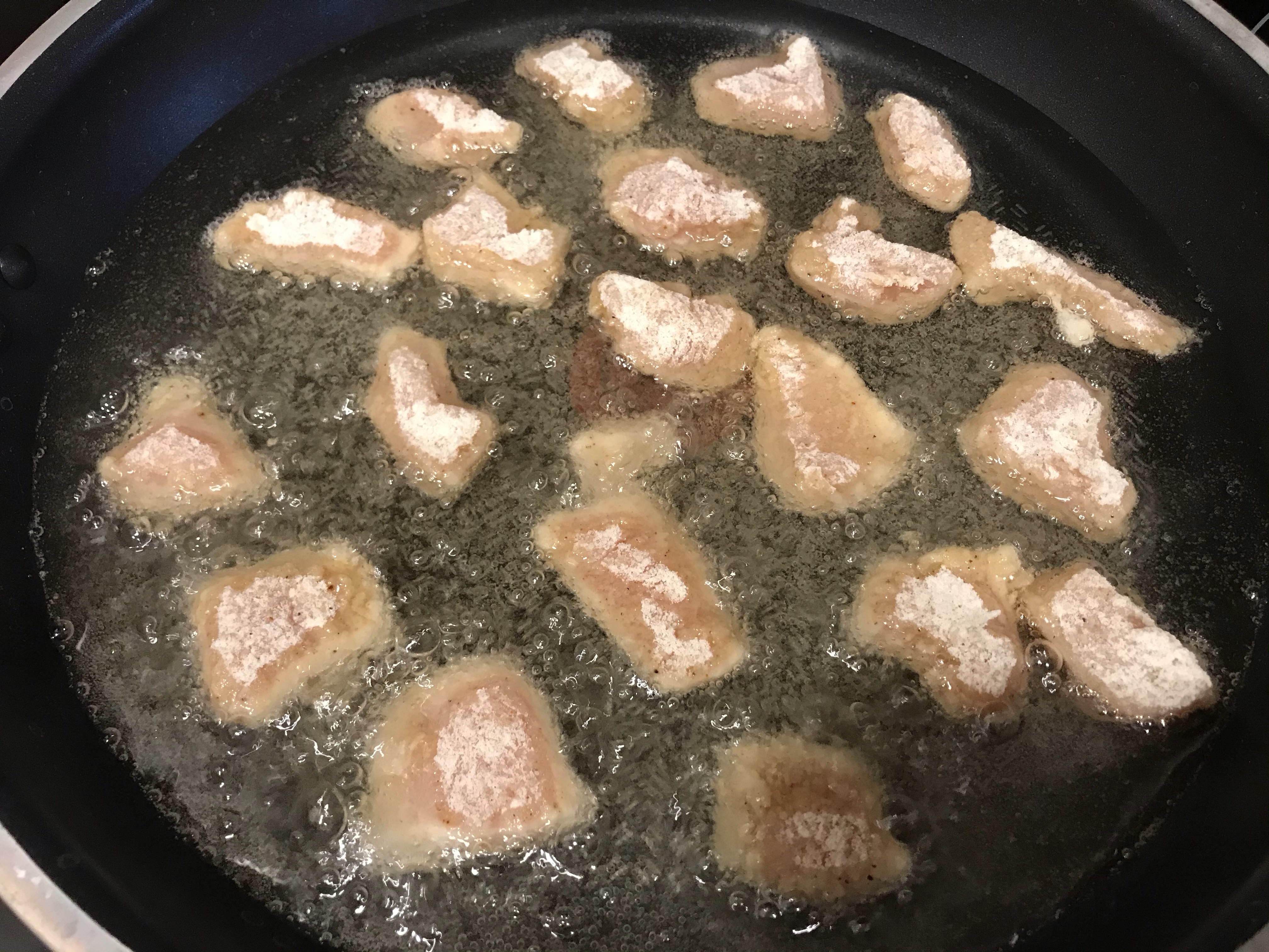 Remove chicken from fridge and dip into mixture until it’s all coated and place into your hot pan.