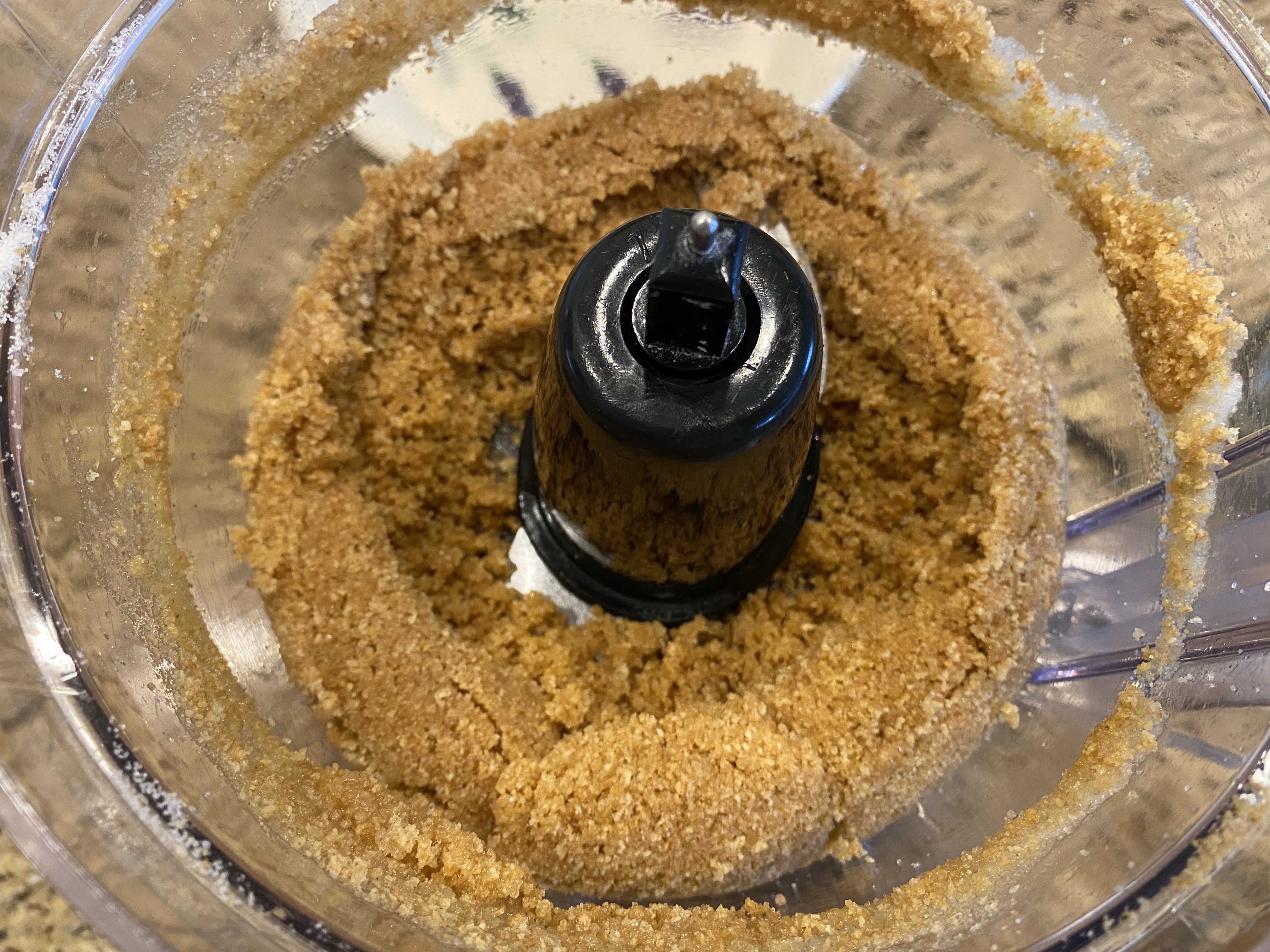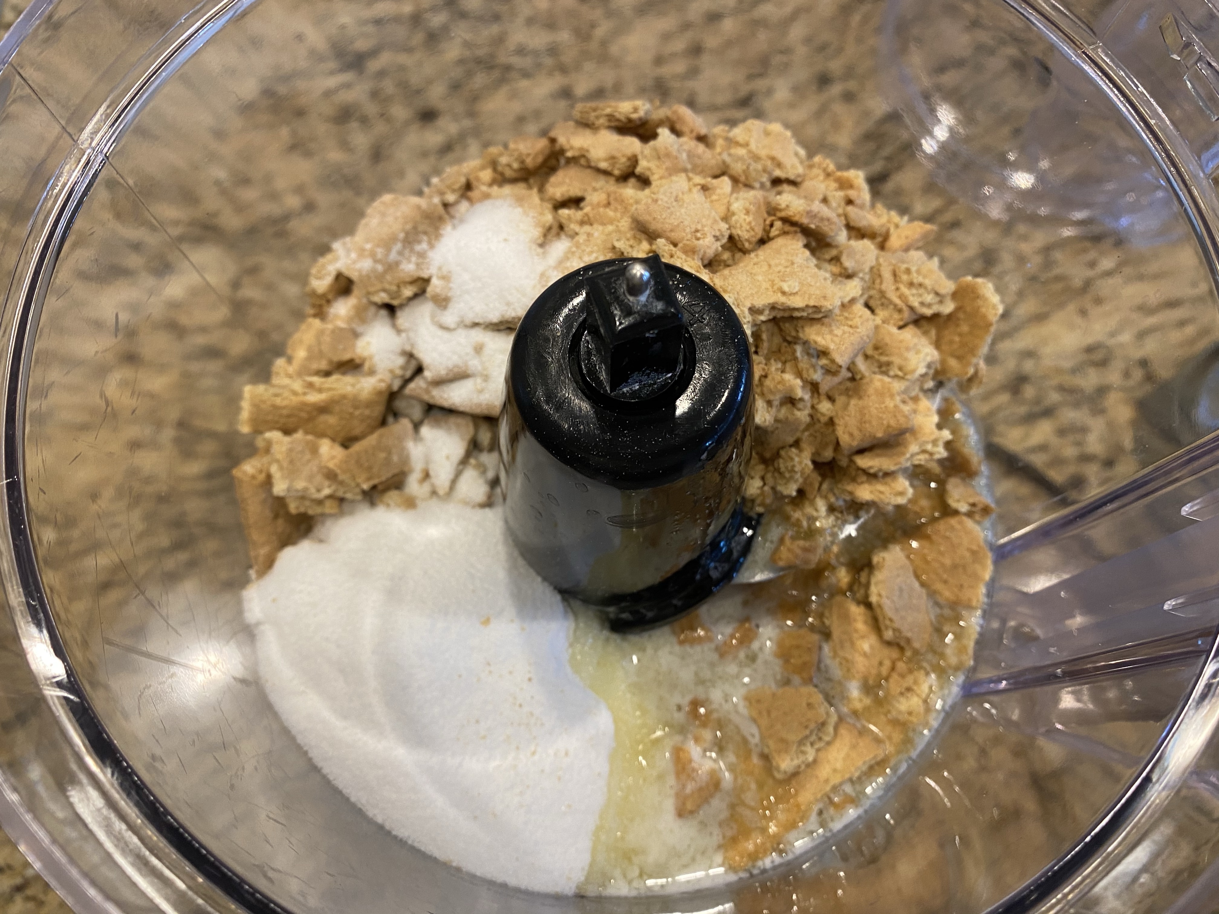 Preheat your oven to 350 degrees. Place grahams, butter, and sugar in the food processor. Pulse until combined.