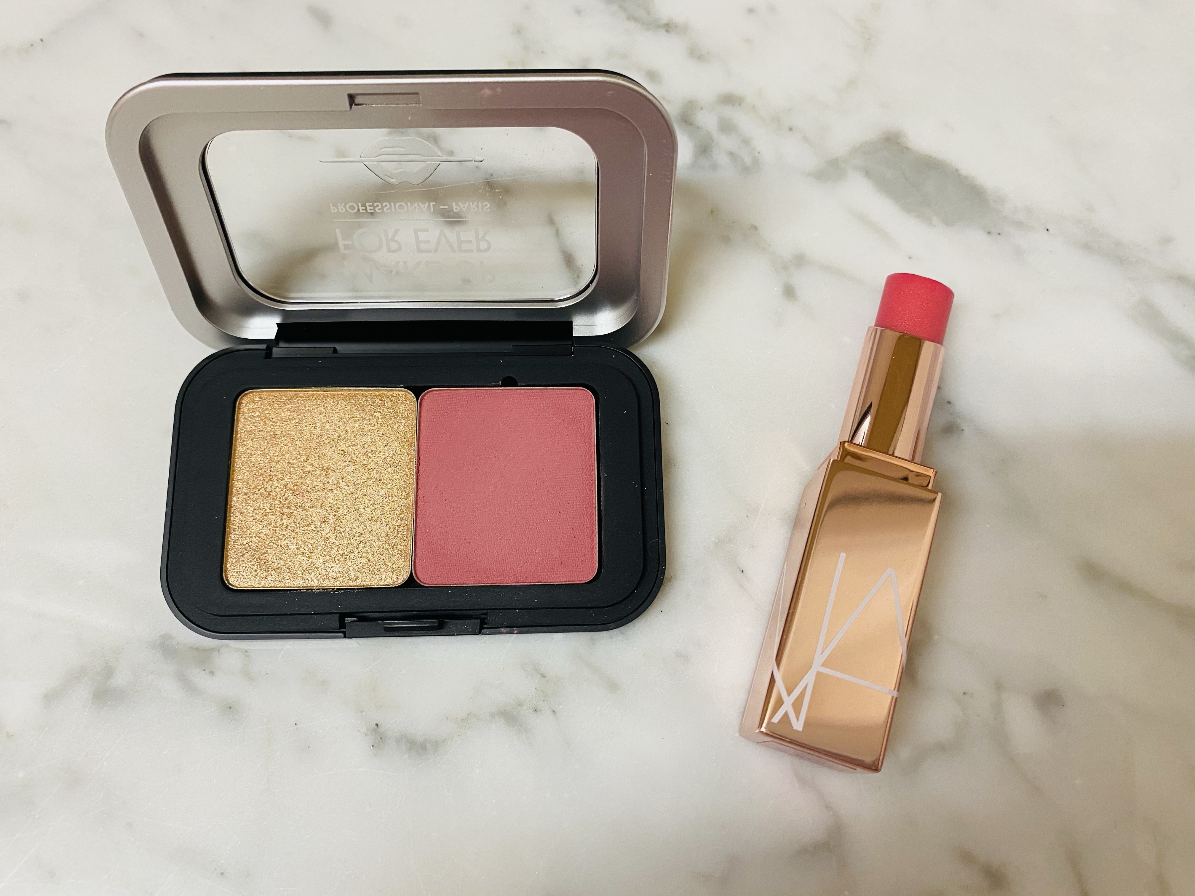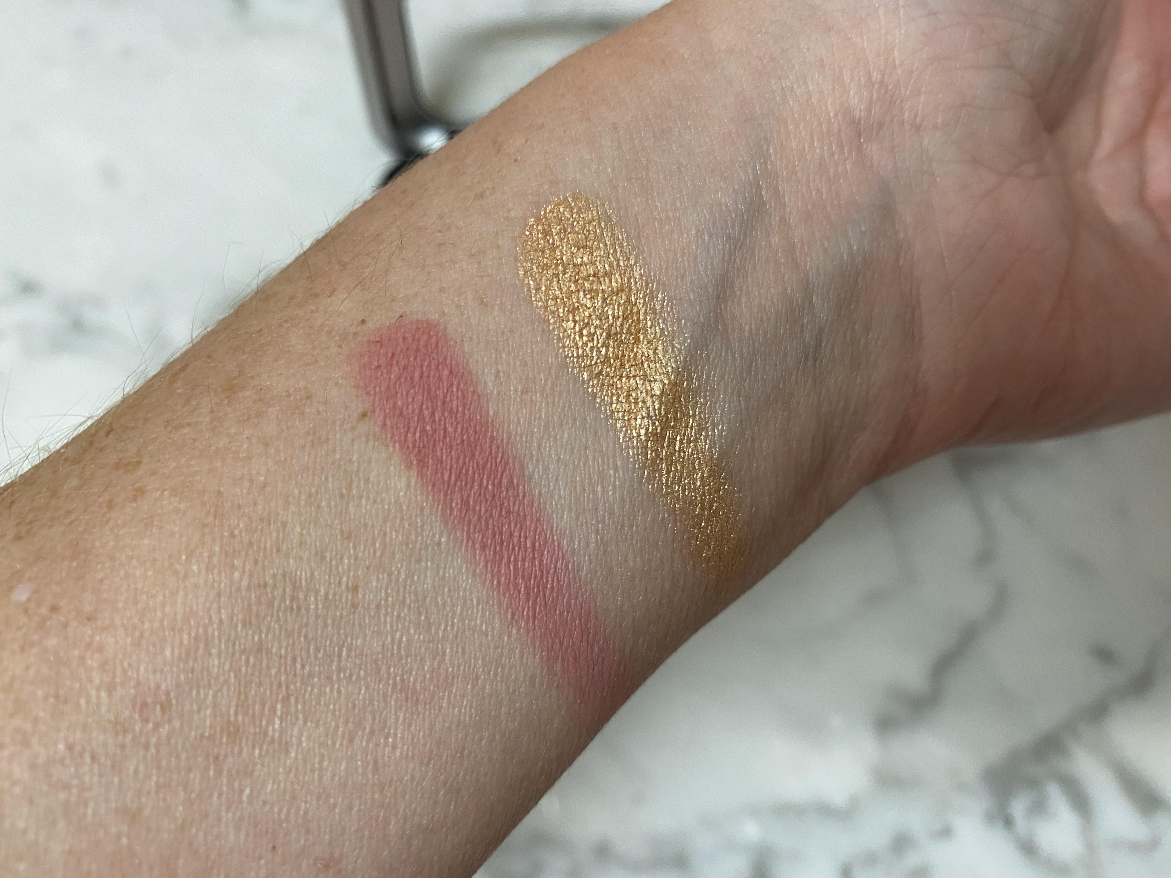 I saved the best for last! This little Make Up For Ever Cheek Duo is SO GOOD. It comes with a rosy pink matte blush and a golden shimmery highlight powder. These colors are gorgeous and perfect for spring. Here are the swatches.