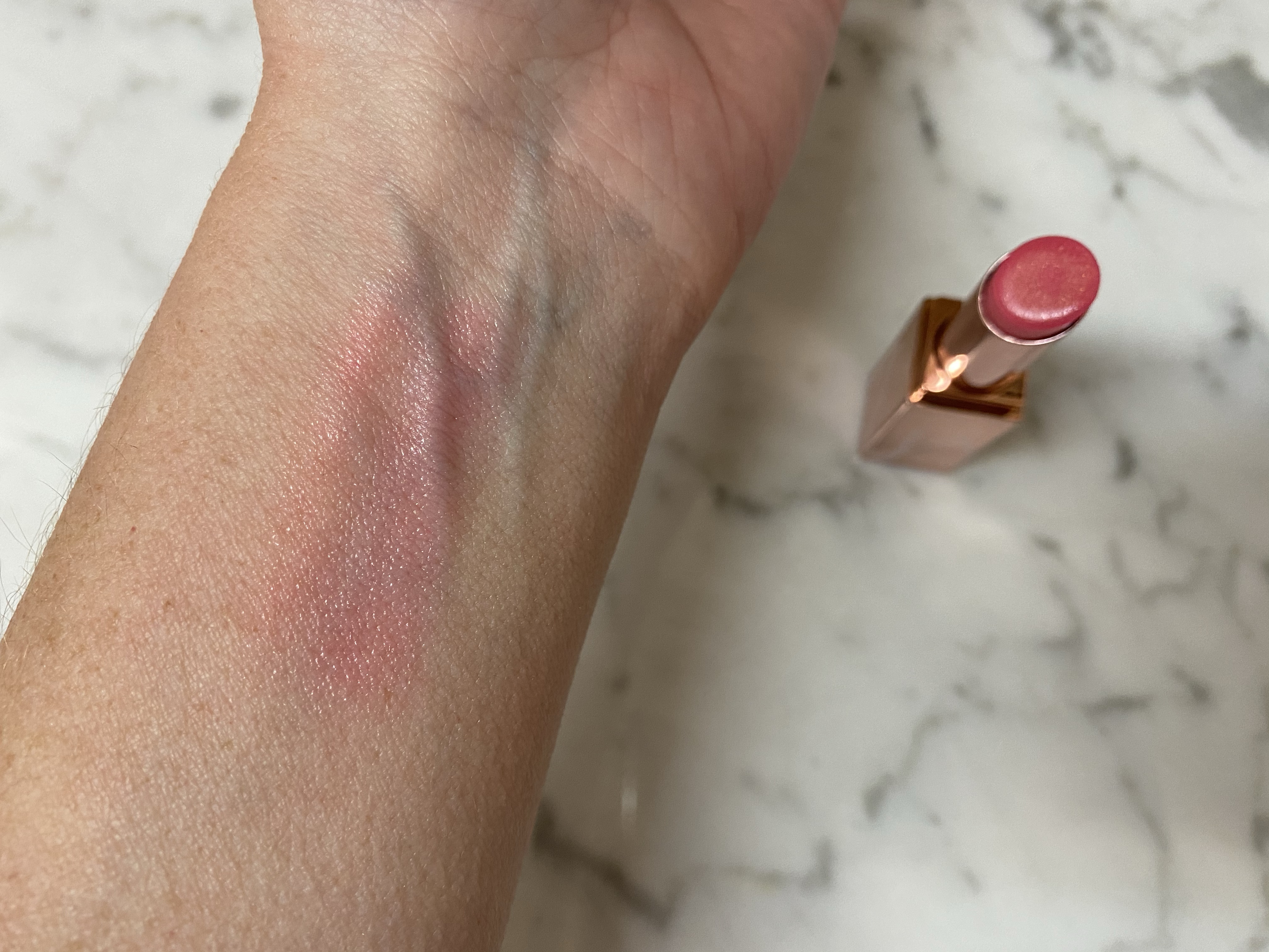 Lastly, and probably my most favorite product of the month, the NARS Afterglow Lip Balm in Orgasm. I LOVE a tinted balm; it’s my favorite type of lip product to wear. This lip balm is amazing even down to the rose gold packaging. It is a sheer pink color with the golden shimmer just like the blush. It is so pretty.