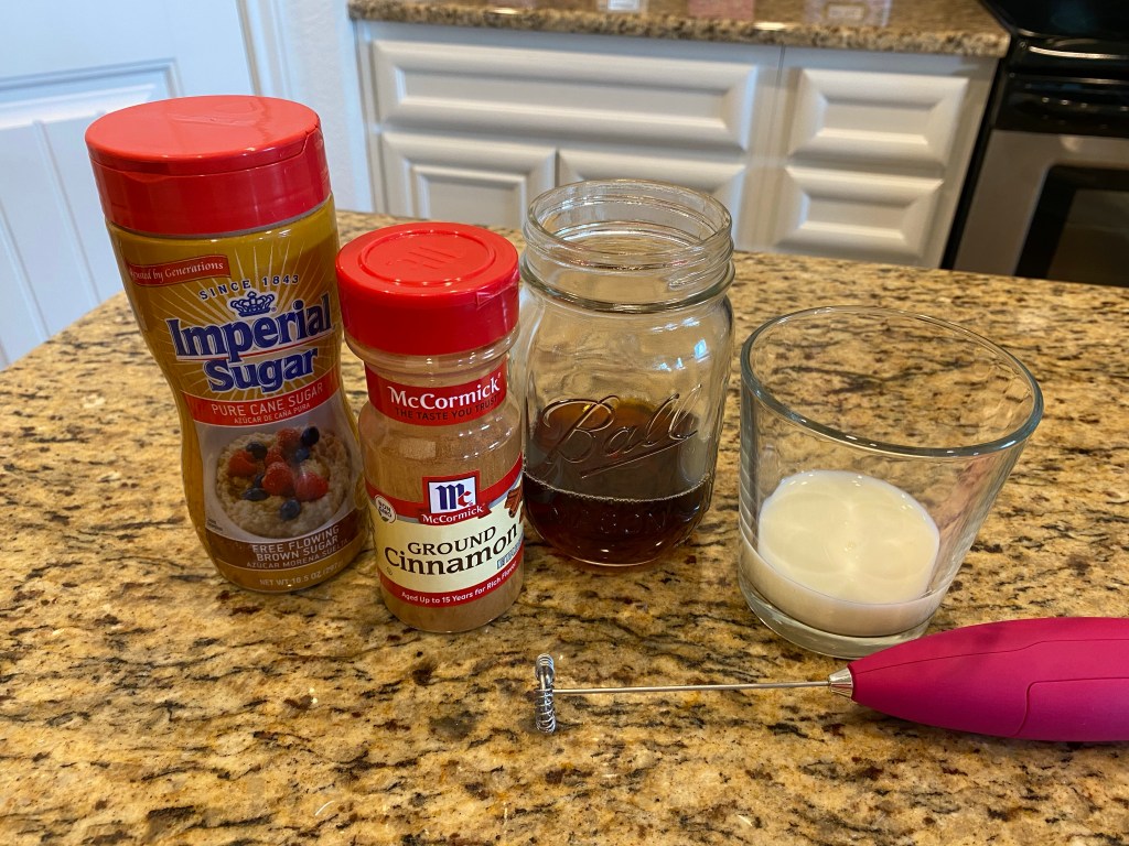 Brew your espresso shots into a mason jar, and while it is still warm, add in your brown sugar and cinnamon, and give it a good shake. Mine got really foamy.
