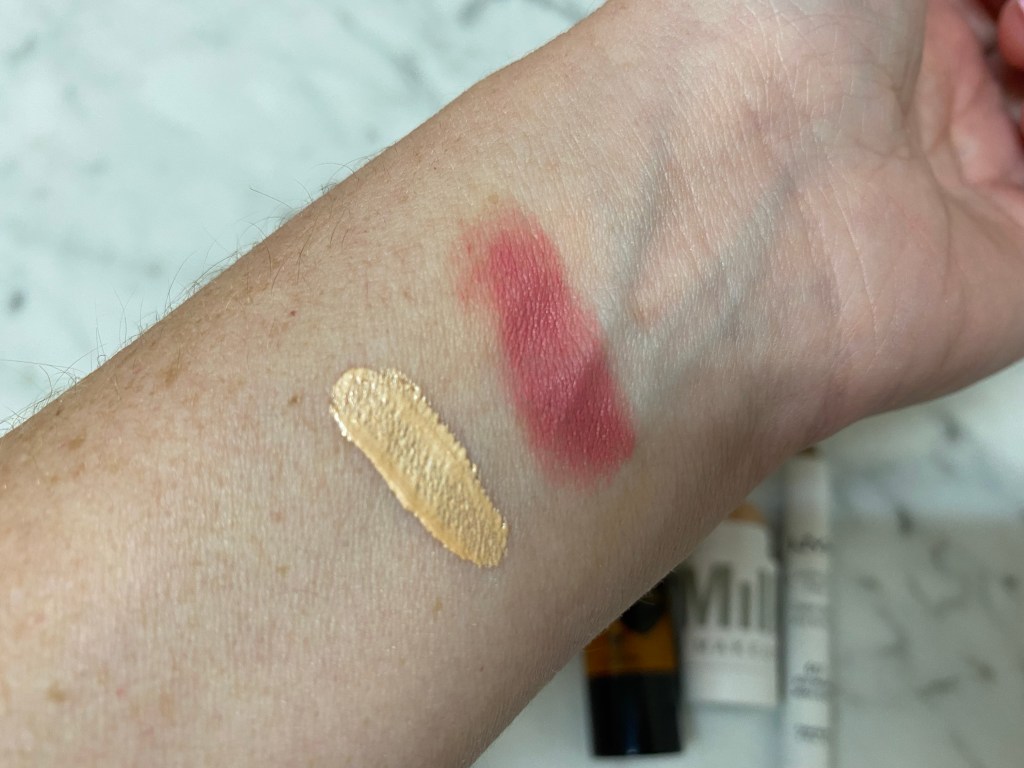 For highlight, I love this Lit color by Milk. This is a light champagne gold shimmery color without glitter. I use a bit of this on the high points of my face (above blush on very top of cheeks, a tiny bit on the top of my nose, and in my inner corners). I swear, this makes me look youthful! I love stick products like these because they’re so easy to just dab on.