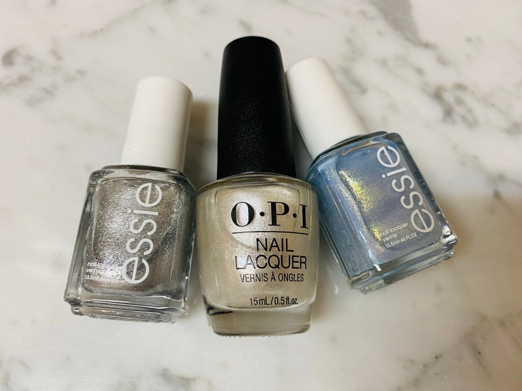 These colors are so pretty and shimmery, but without the chunks of glitter. Essie Jingle Belle is a silver chrome, OPI Happy Anniversary is a white pearl, and Essie Love At Frost Sight is a frosty silver light blue color. All of these are gorgeous on the nails, and give that chrome look.