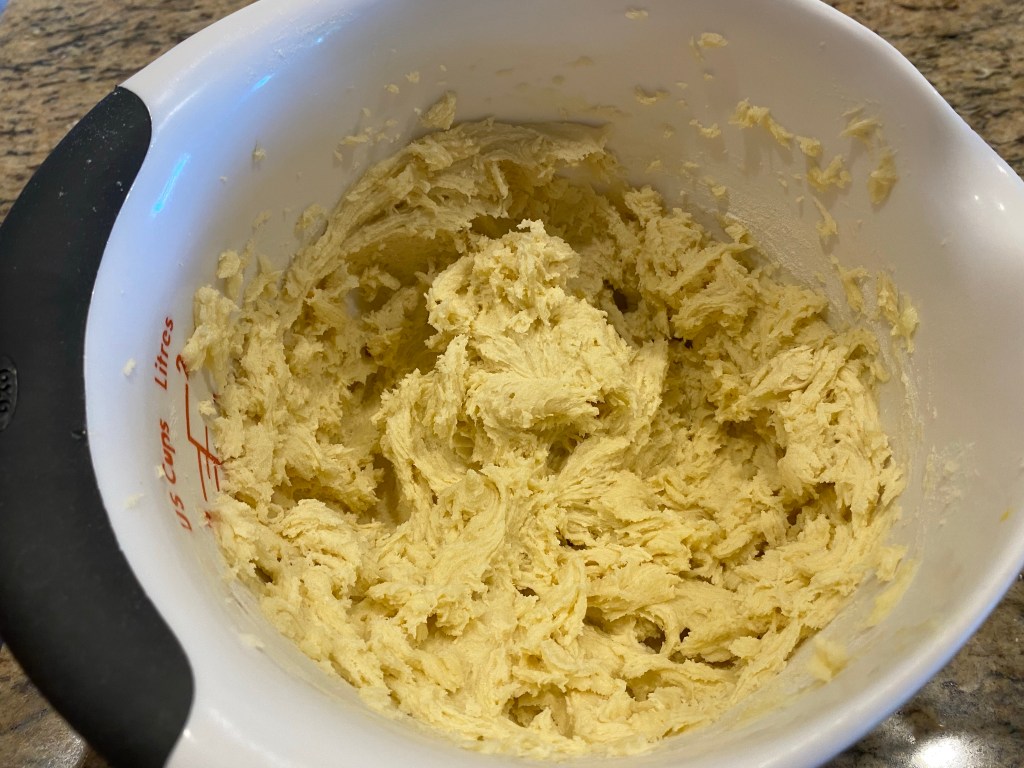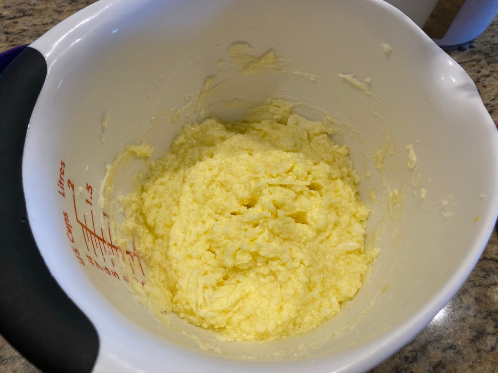 Preheat your oven to 350 degrees. Cream together butter and sugar, and then add eggs and extracts.