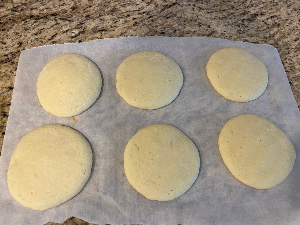 Scoop 1/4 cup of dough and make it into a ball. Place on your baking sheet and flatten them down with your fingers.