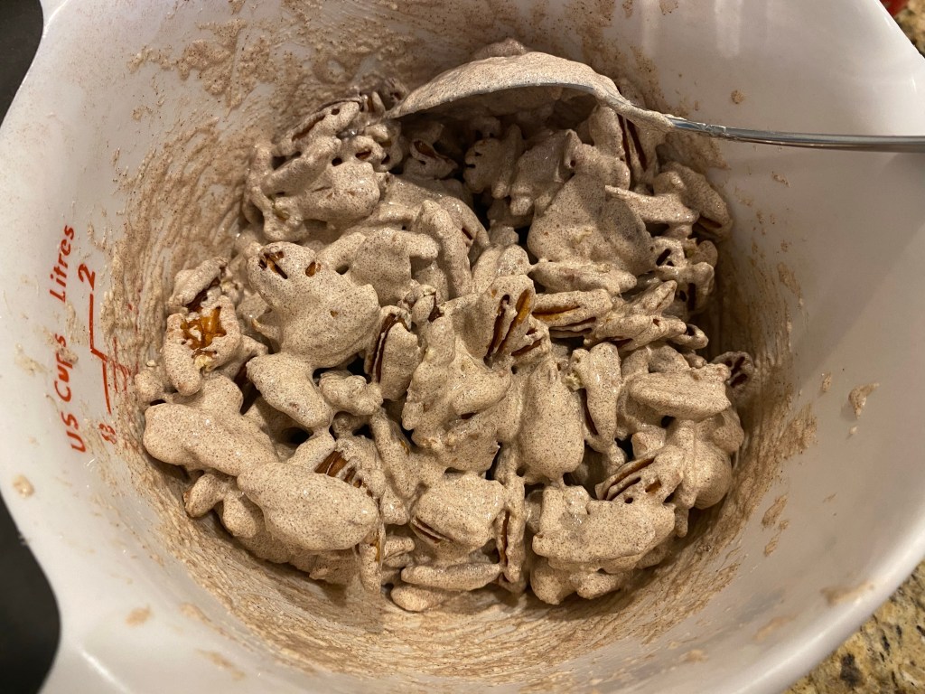 Next, add in all of your pecans and coat them evenly with your mixture.