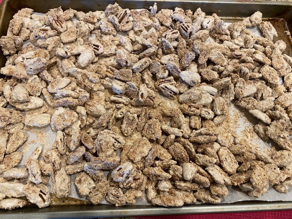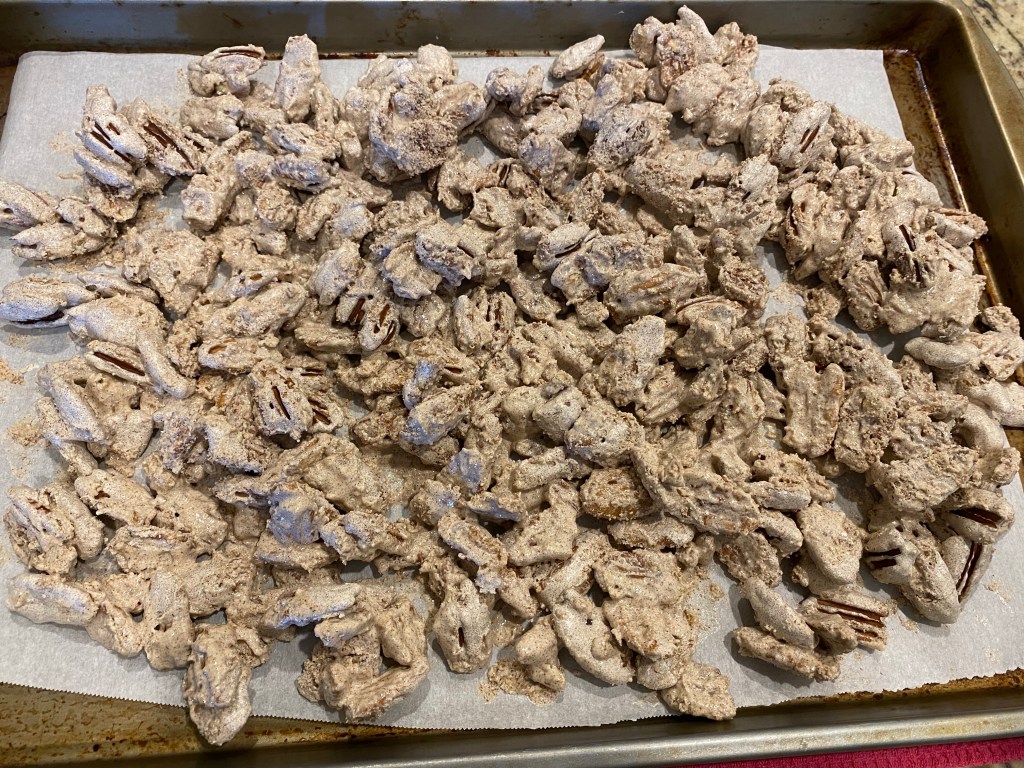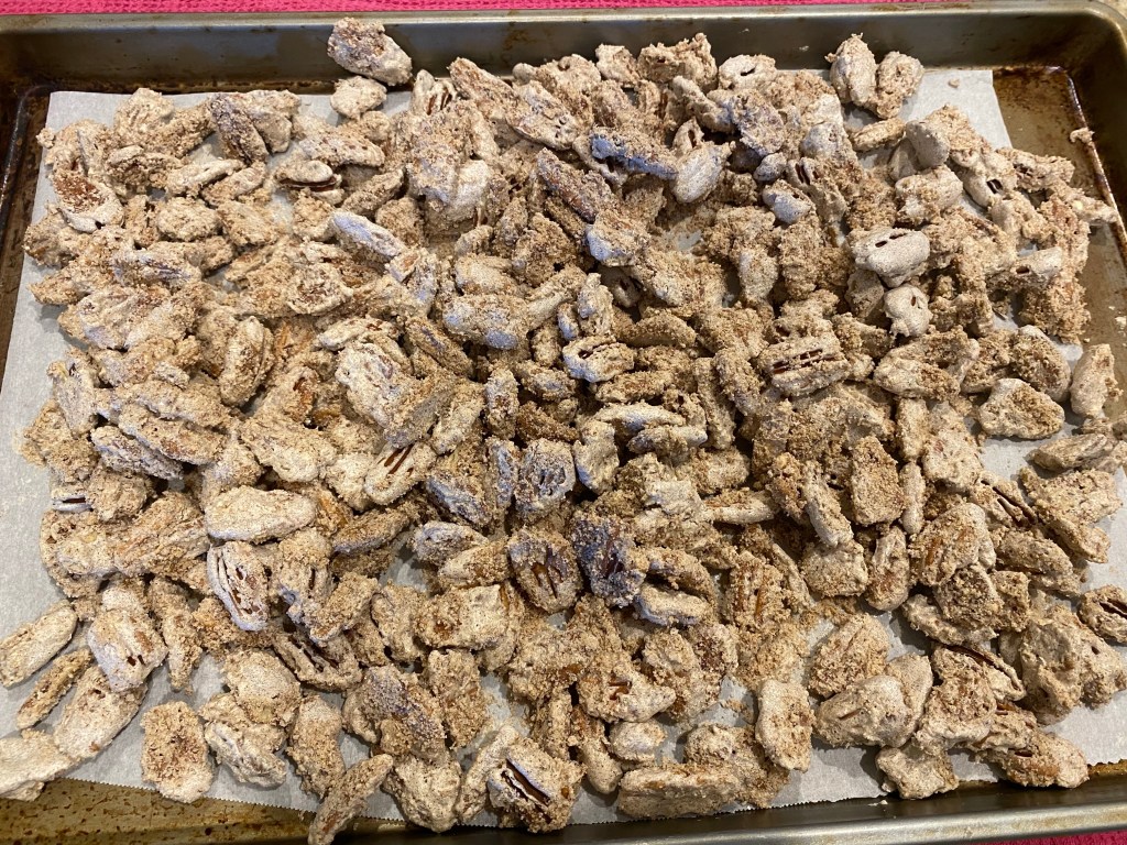 Today I am sharing a fun holiday treat that is super easy and fun to make! If you are a nut lover, you will love these cinnamon-y crunchy coated pecans! My family loves any kind of nut, and my girls and husband love these. We have also tried this recipe with almonds, but we prefer pecans because they get very crispy in the oven. These are perfect to bring for a holiday party or to give as a gift to someone in a little jar with a bow. Here’s how we make them!
