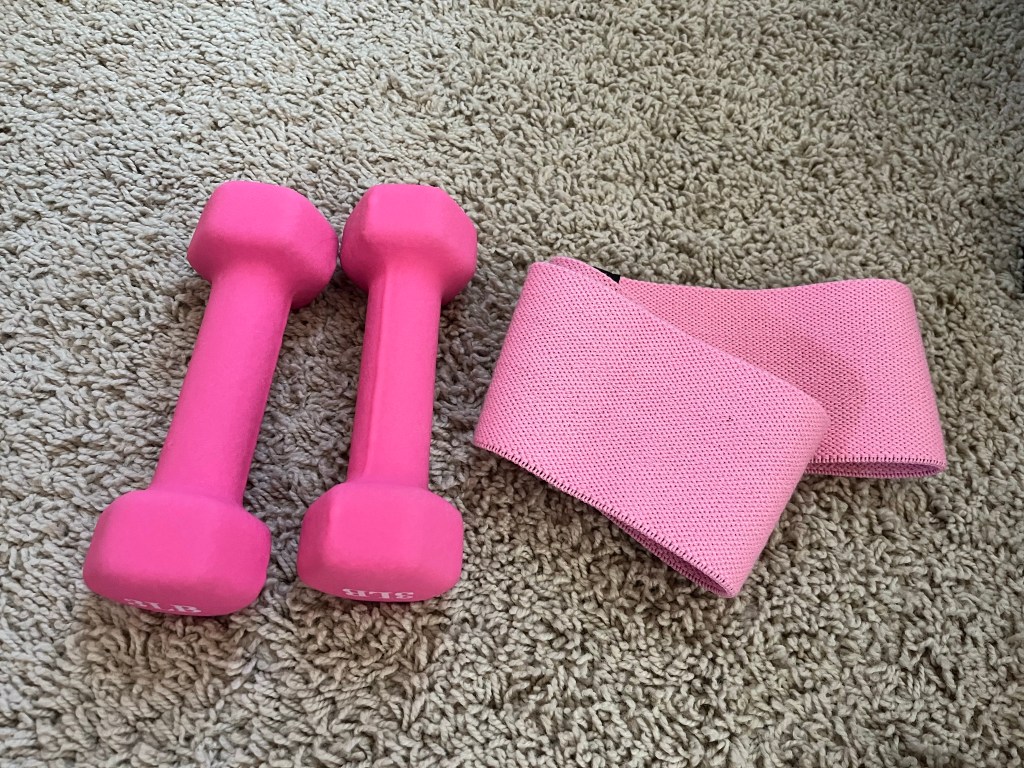 I have a pair of 3 lb weights that I use for the arm workout, and also a resistance band that I use on my legs and thighs.