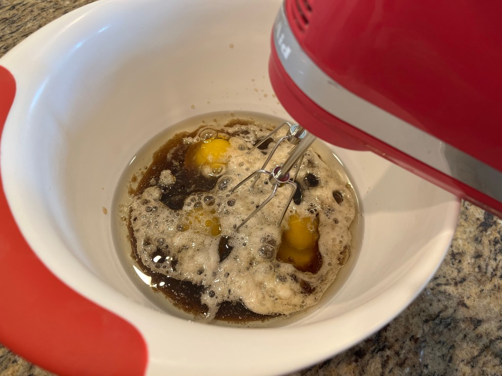 Preheat your oven to 350 degrees. Pour your Coke into a large mixing bowl, add your eggs and oil, and mix.