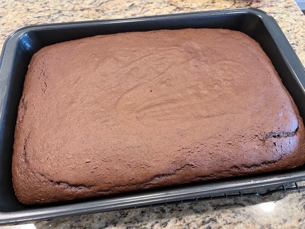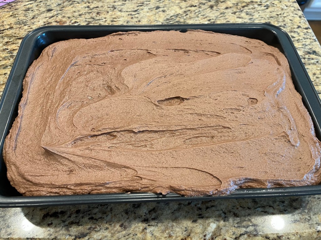 Spread batter into a 9×13 pan (it’s a sheet cake baby!) and bake at 350 degrees for 25-30 minutes.