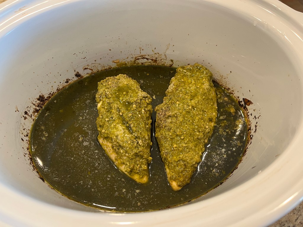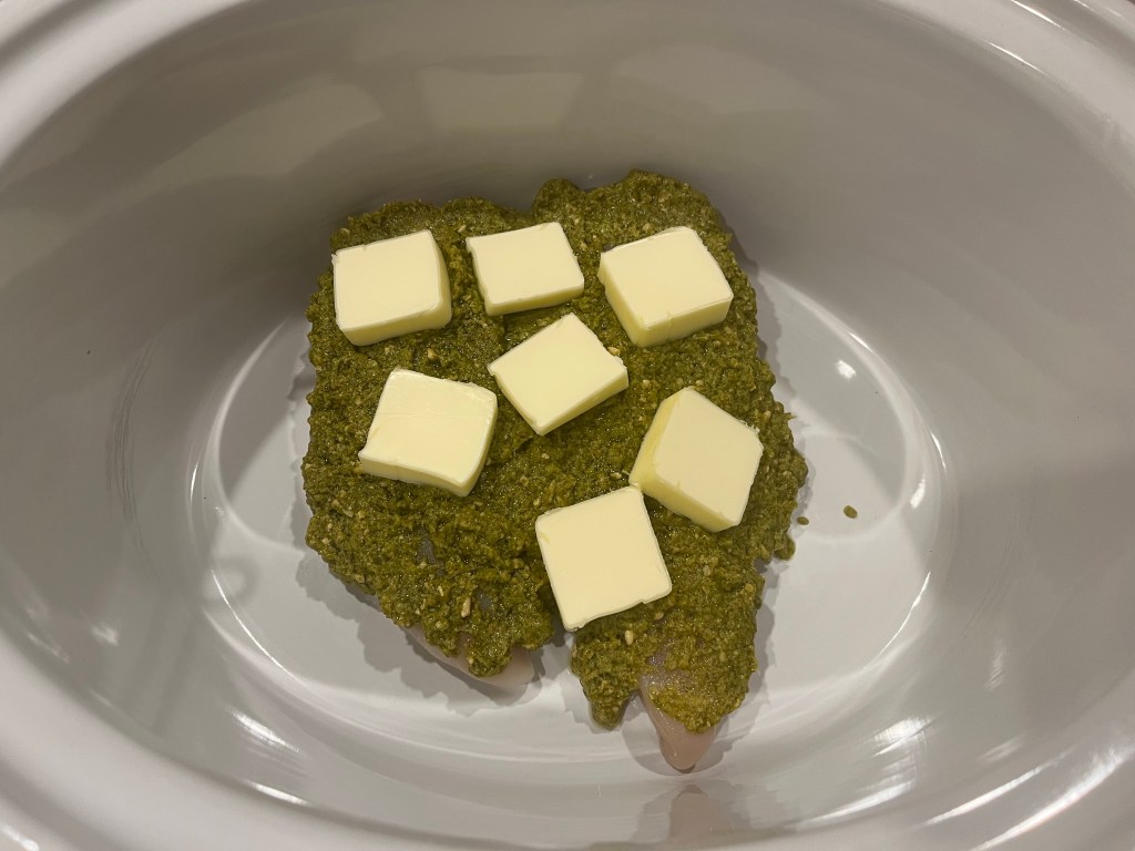 Cover the chicken with your pesto. A little jar like this one is just fine.